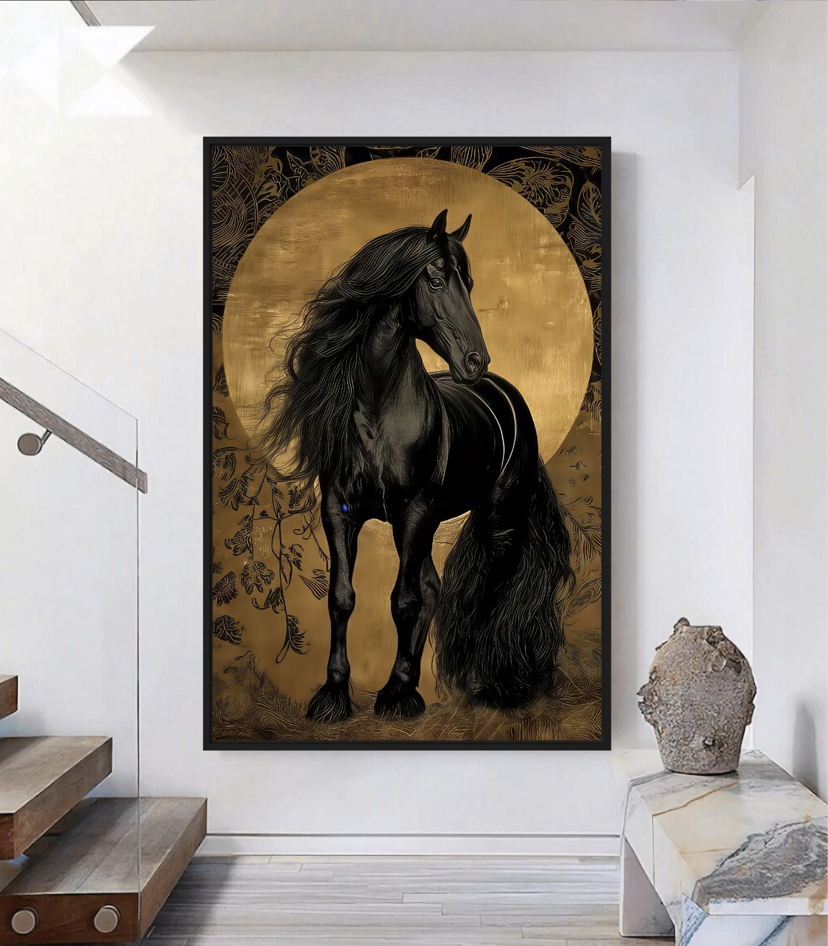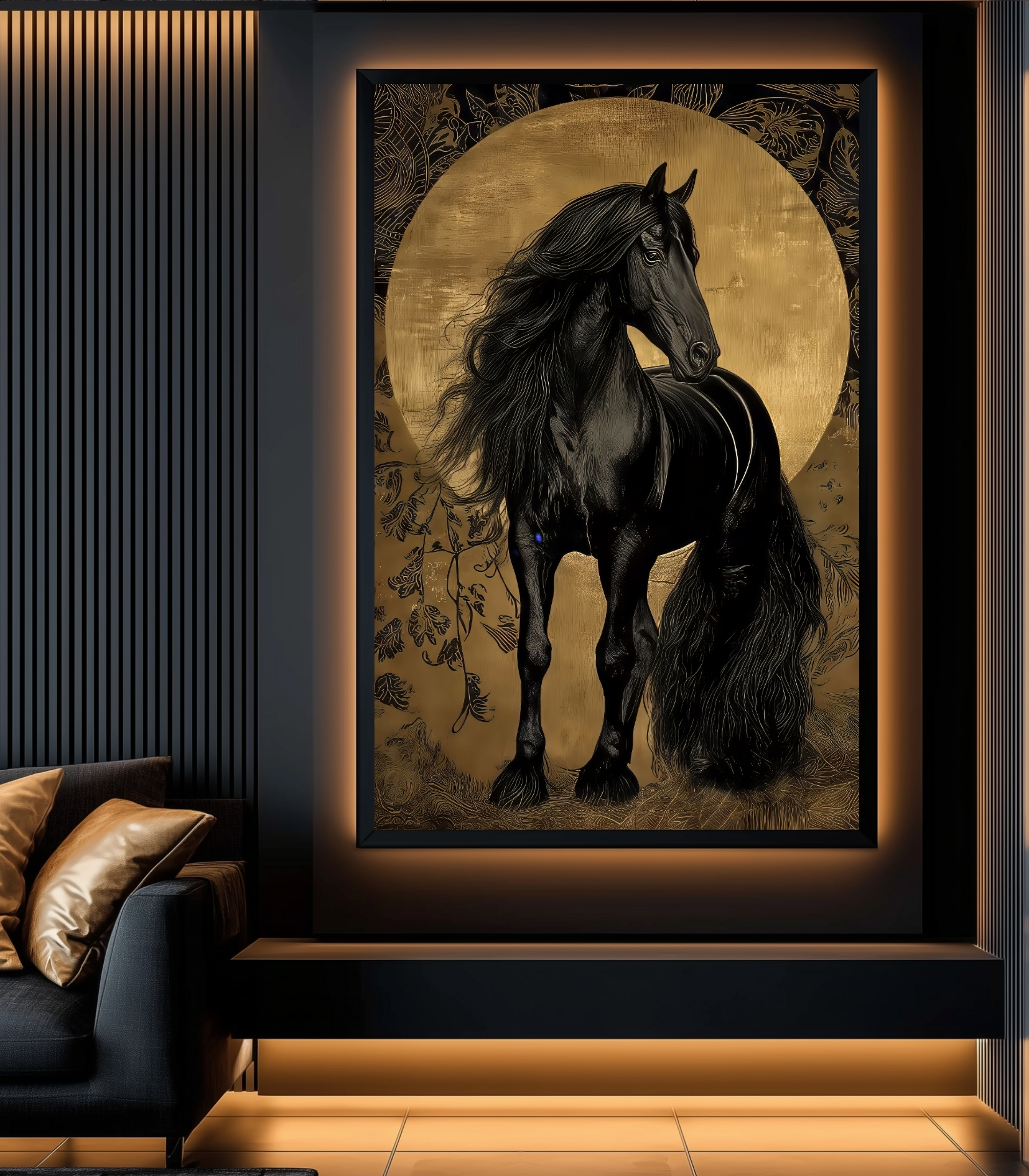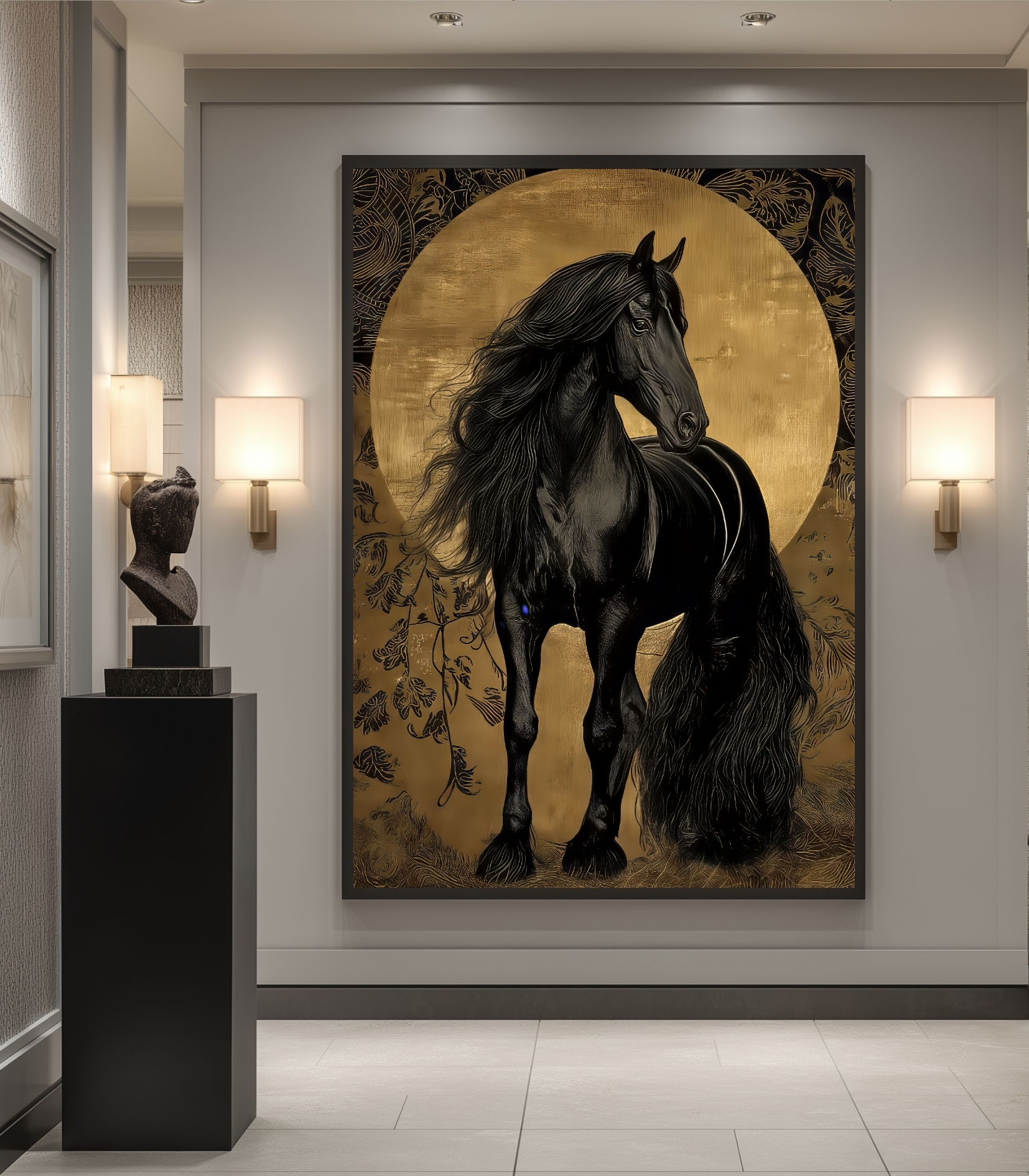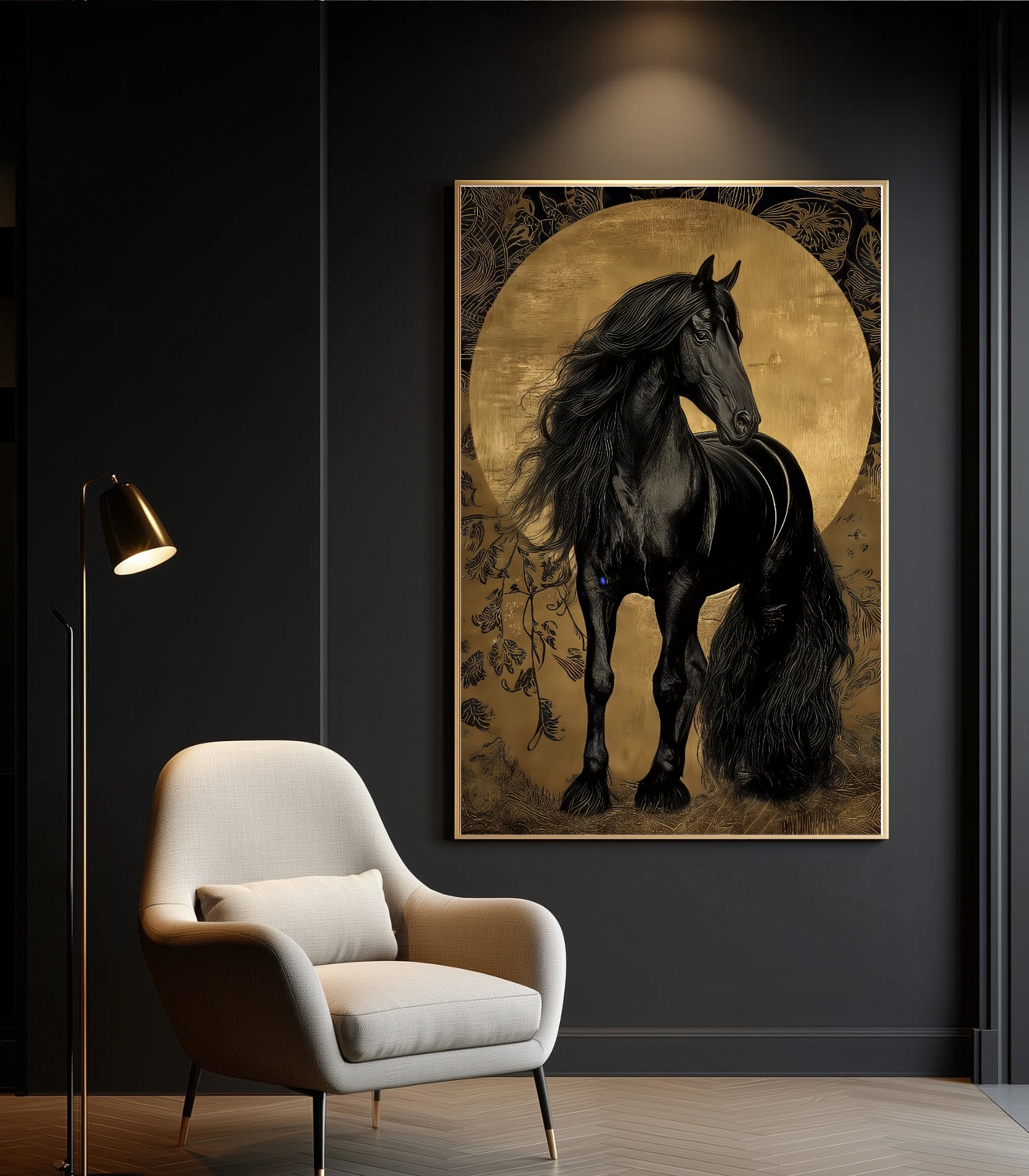 تابلو اسب مشکی با زمینه طلایی منحر به فرد انخابی مدرن و لوکس برای پذیرای و اتاق خواب و دفتر کار