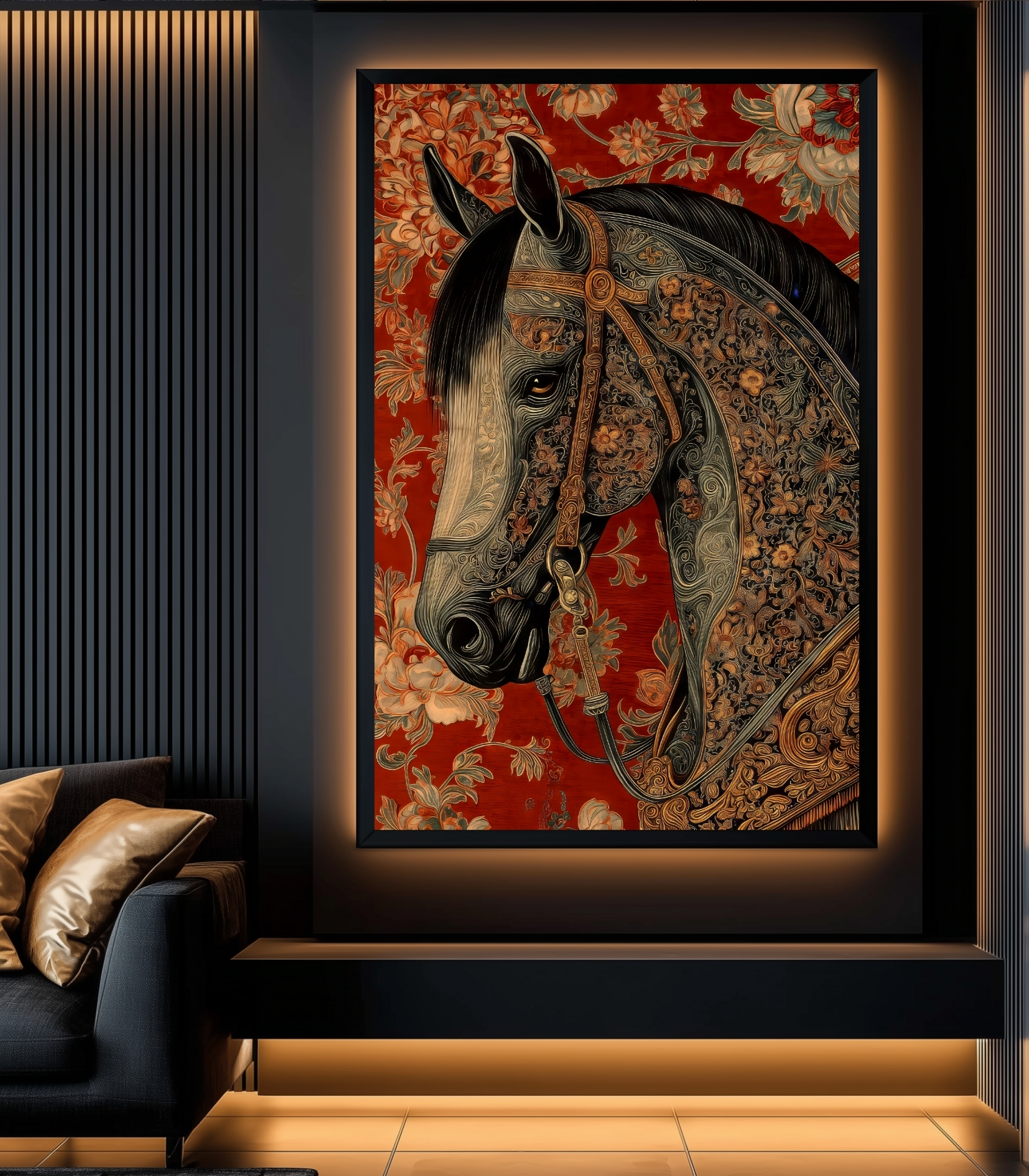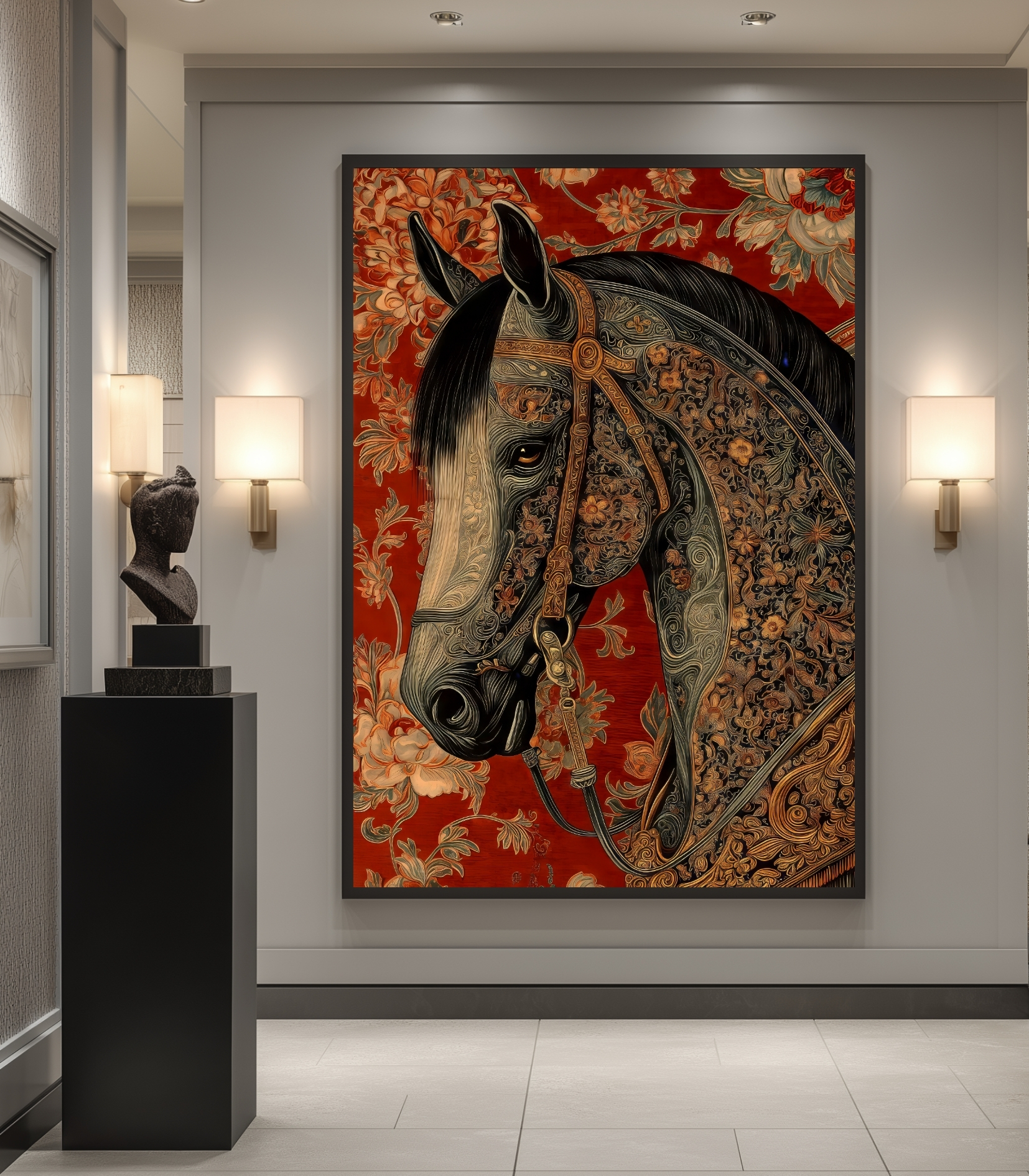 تابلو دکوراتیو اسب شرقی کلاسیک و جزئیات تزئینی الهامگرفته از هنر شرقی، نمادی از قدرت، اصالت و ظرافت را به نمایش میگذارد. ترکیب رنگ قرمز عمیق در پسزمینه با نقوش سنتی و طراحی دقیق چهره اسب، فضایی گرم، مجلل و هنری ایجاد میکند که نگاه هر بینندهای را به خود جذب مینماید.