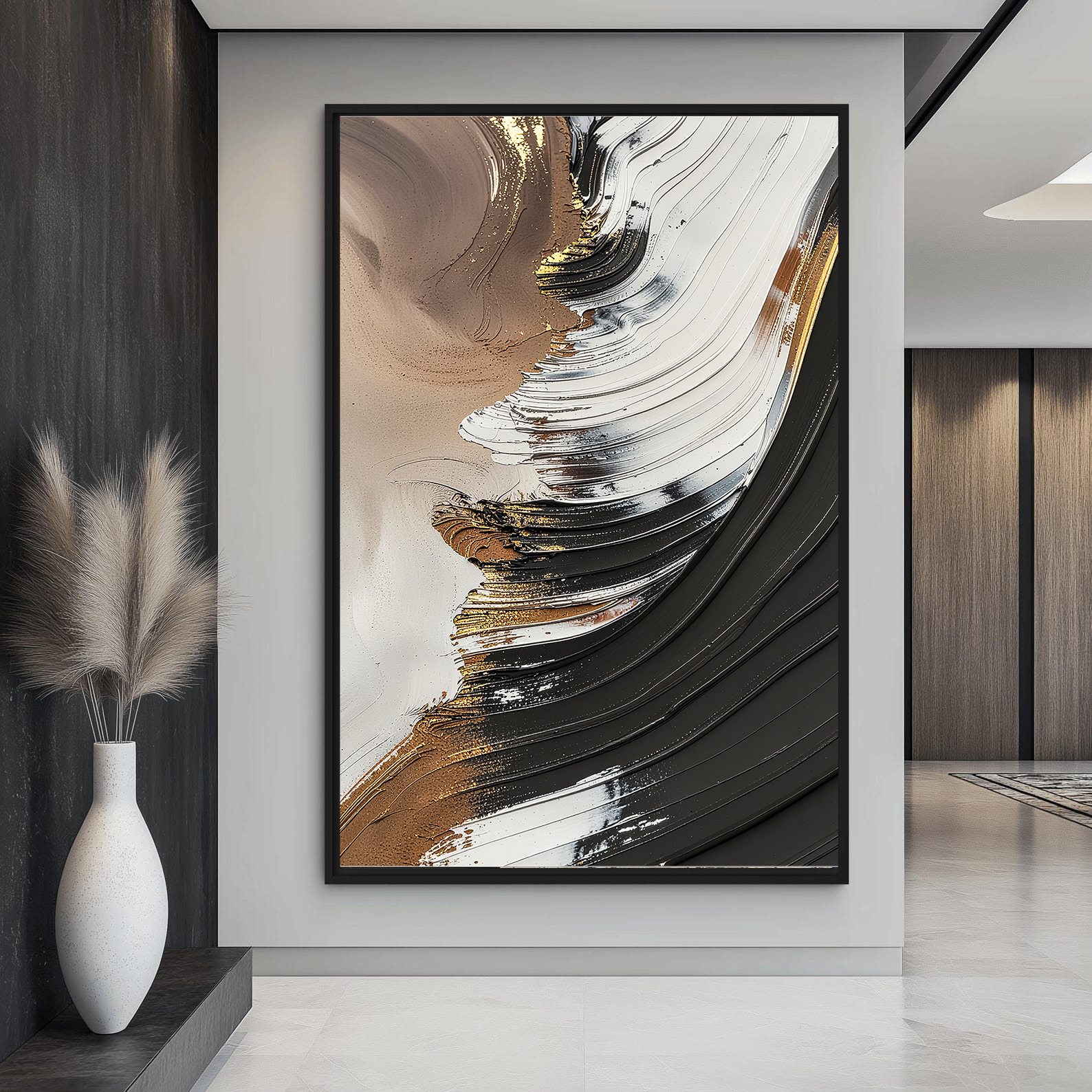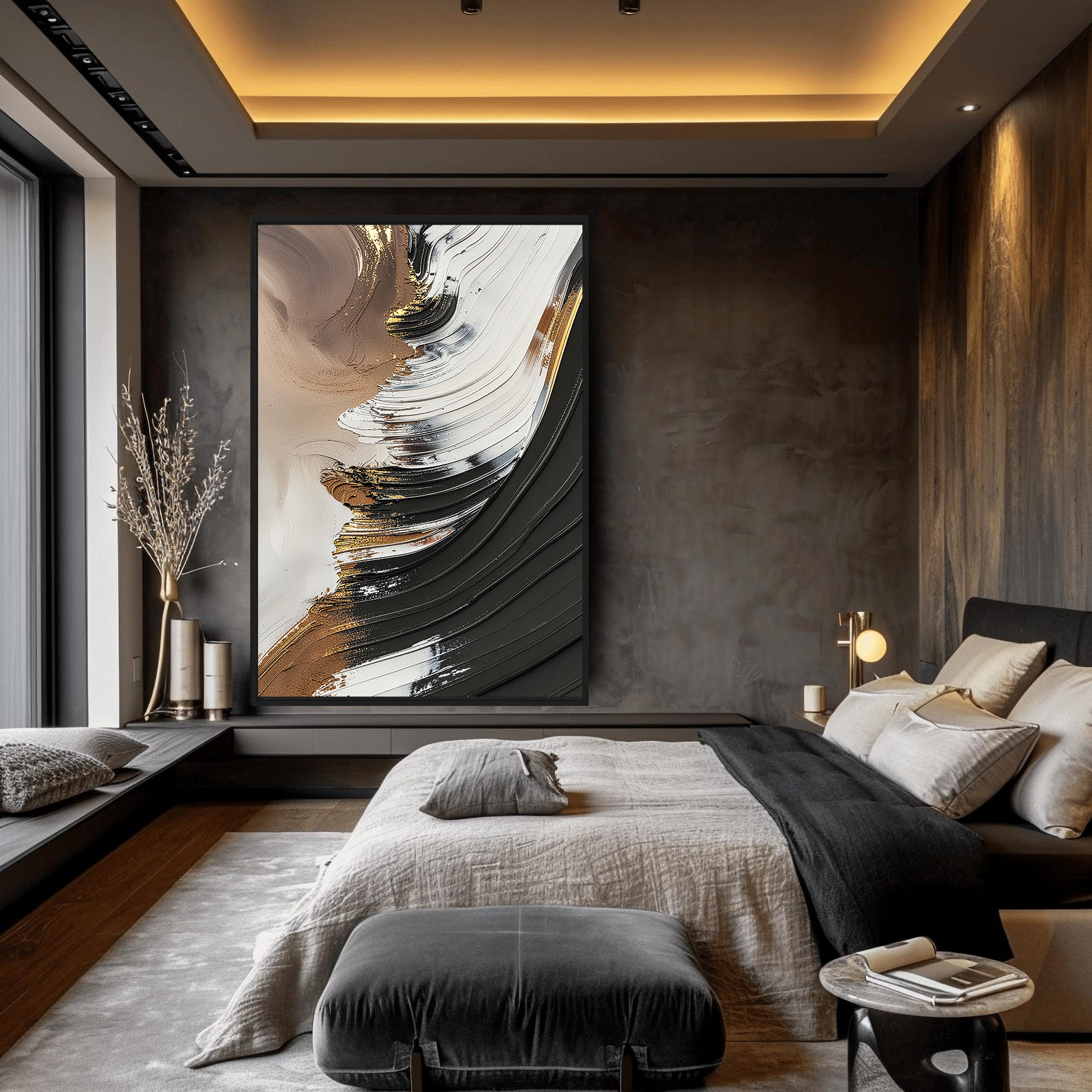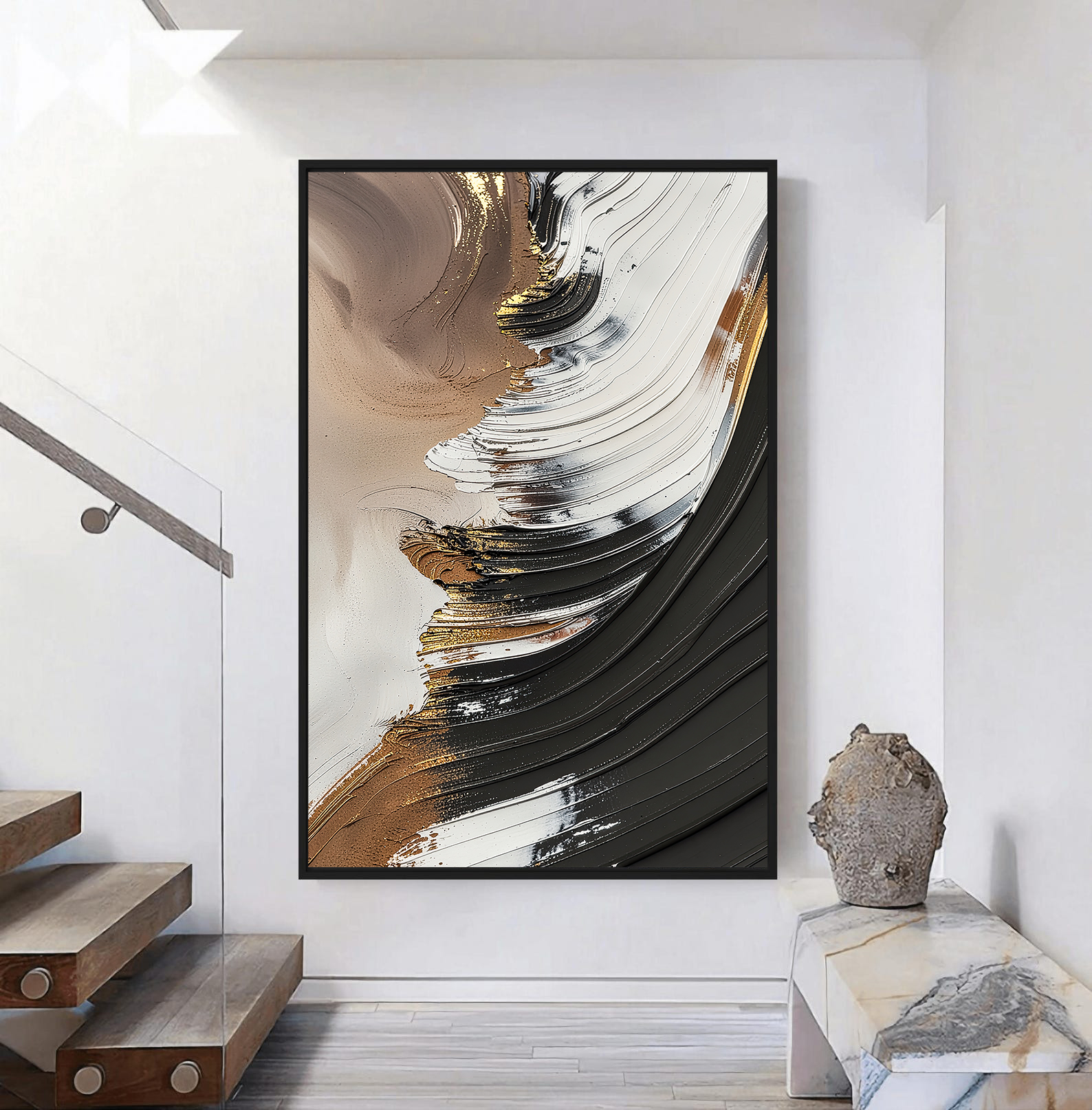 تابلو دکوراتیو انتزاعی قهوهای و مشکی، اثری هنری با تکنیک برجسته و سهبعدی (3D) که حرکت موجگون و بافتهای غنی رنگ را به تصویر میکشد. ترکیب رنگهای قوی و خنثی شامل مشکی زغالی، قهوهای سوخته، سفید و رگههای طلایی درخشان، این تابلو را به یک نقطه کانونی پرانرژی در فضاهای مدرن، صنعتی و لوکس تبدیل کرده است. بافتهای برجسته به اثر عمق میدهند و آن را از یک چاپ دو بعدی ساده متمایز میسازند.