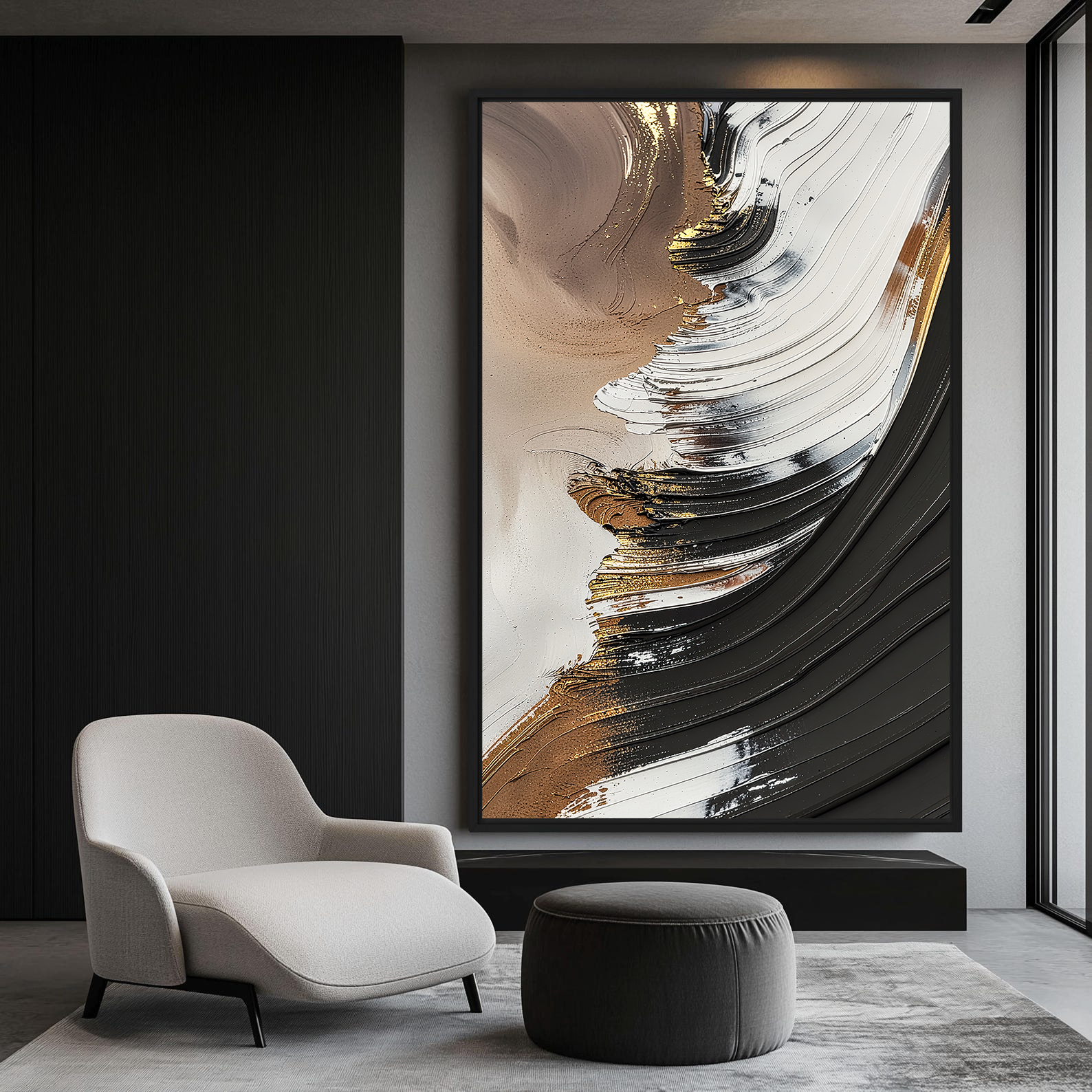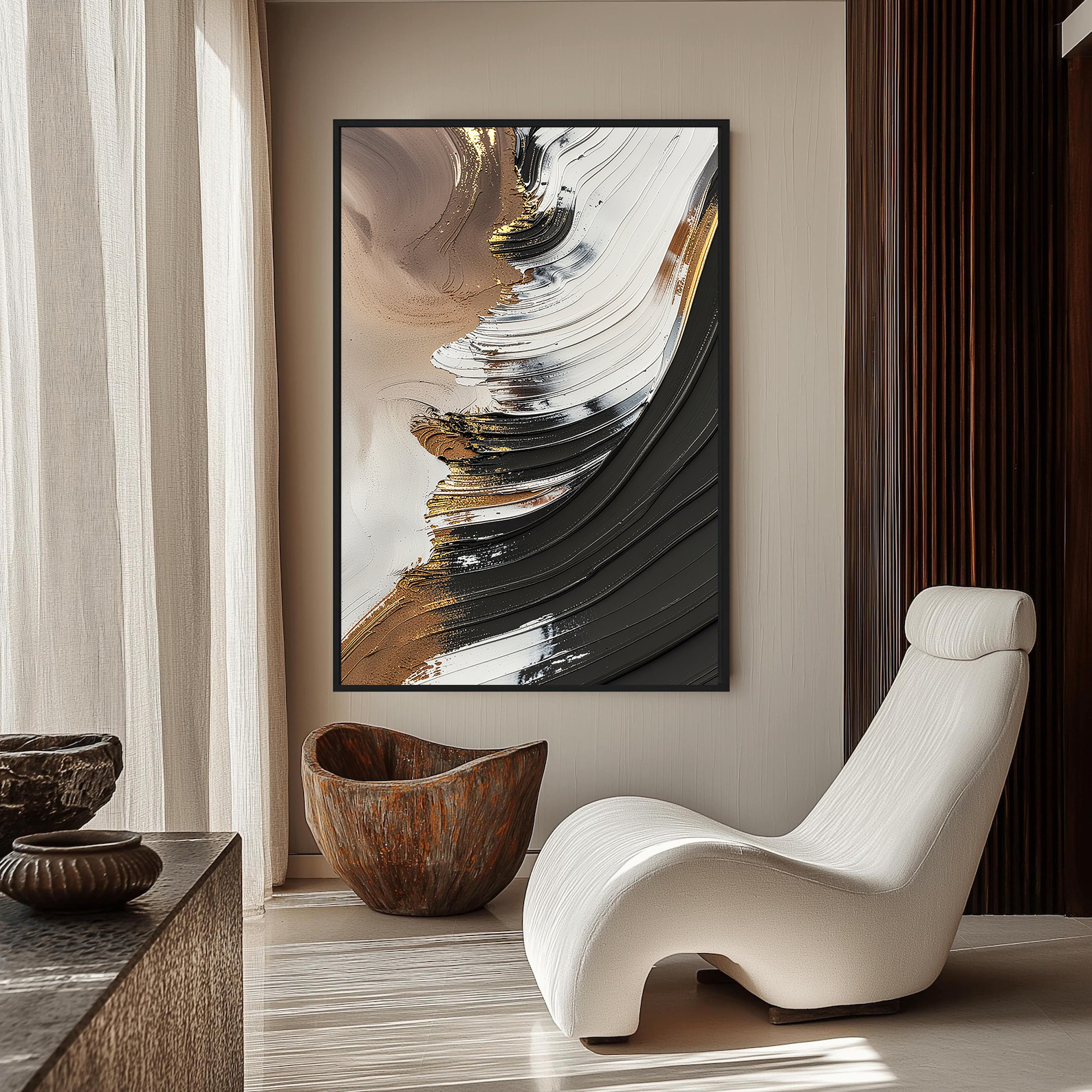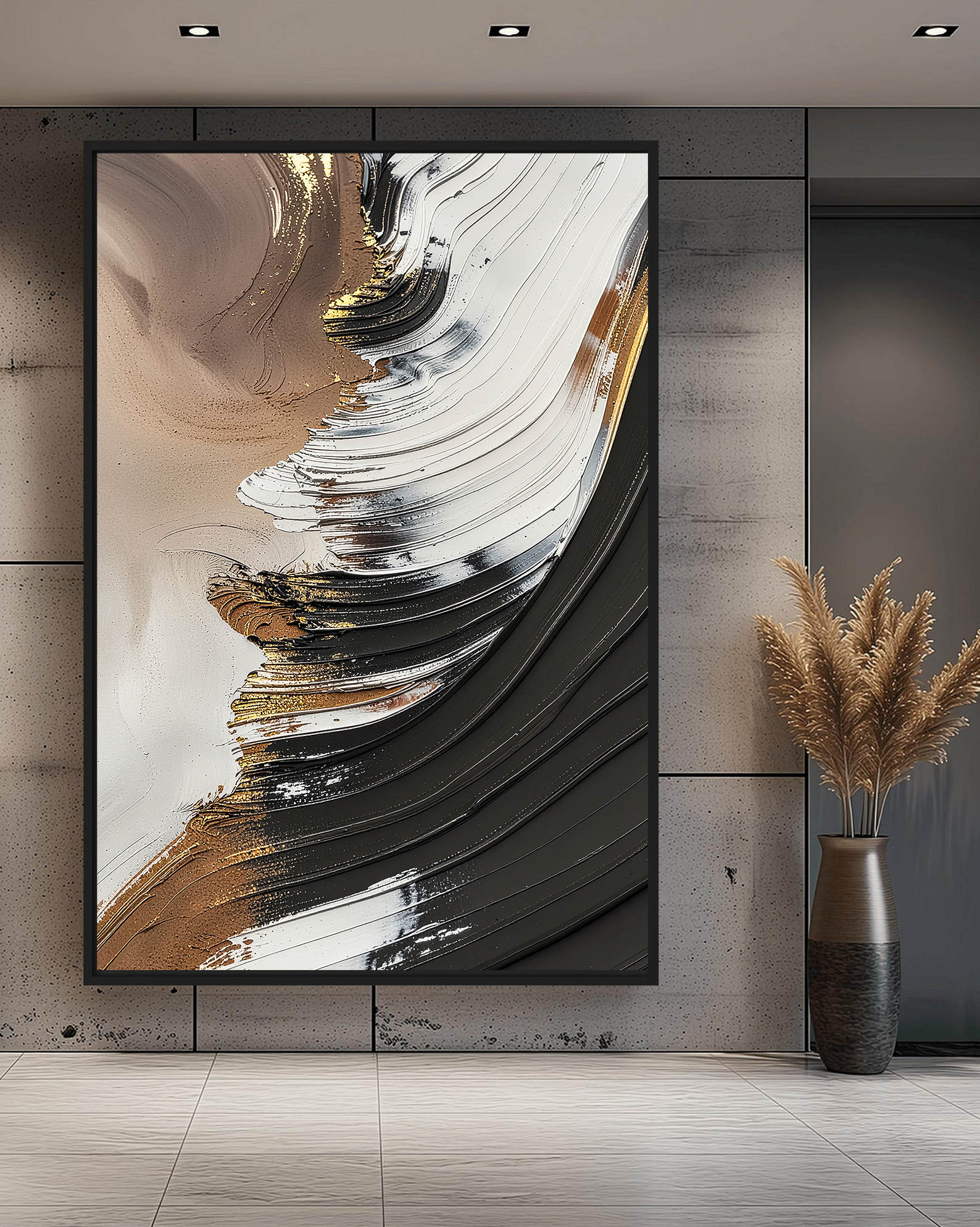 تابلو دکوراتیو انتزاعی قهوهای و مشکی، اثری هنری با تکنیک برجسته و سهبعدی (3D) که حرکت موجگون و بافتهای غنی رنگ را به تصویر میکشد. ترکیب رنگهای قوی و خنثی شامل مشکی زغالی، قهوهای سوخته، سفید و رگههای طلایی درخشان، این تابلو را به یک نقطه کانونی پرانرژی در فضاهای مدرن، صنعتی و لوکس تبدیل کرده است. بافتهای برجسته به اثر عمق میدهند و آن را از یک چاپ دو بعدی ساده متمایز میسازند.