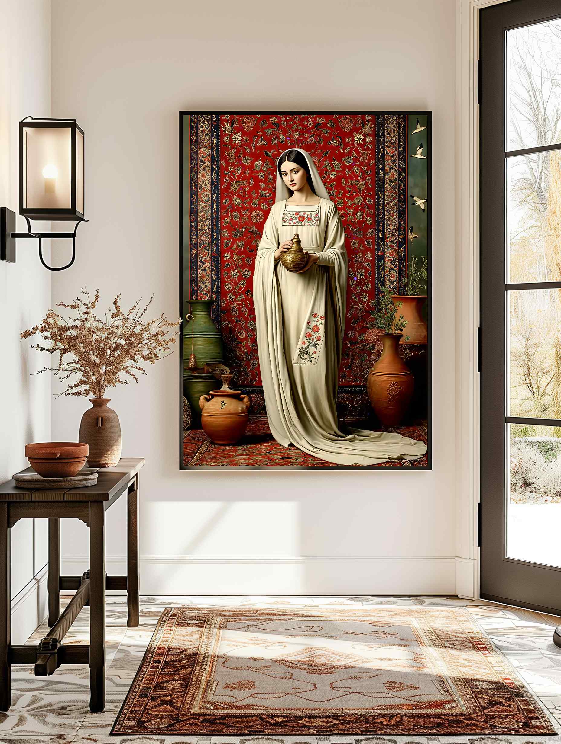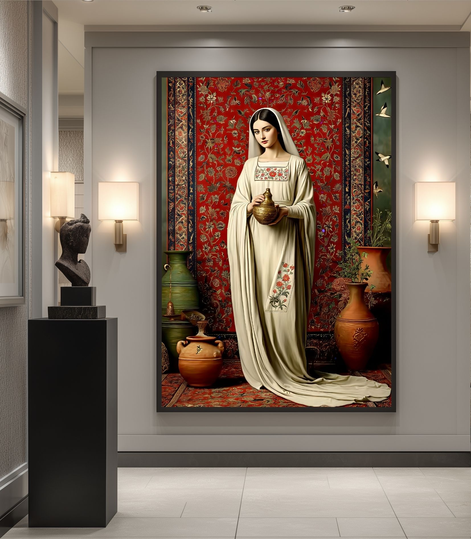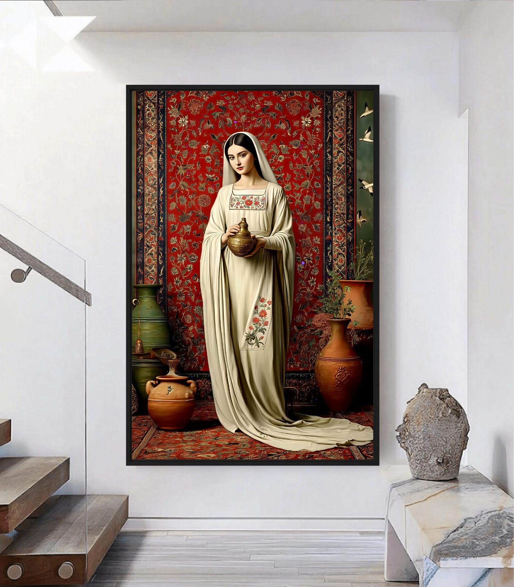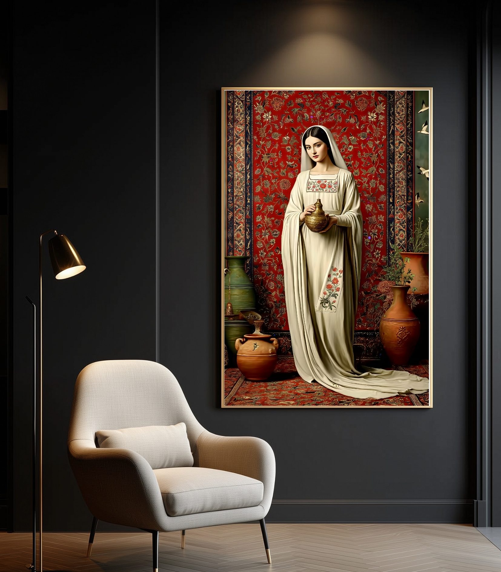 تابلو دکوراتیو بانوی شرقی سنتی با تصویر بانویی در پوشش سنتی و فضایی الهام‌گرفته از هنر شرقی، حس اصالت، آرامش و وقار را به‌زیبایی به دکوراسیون منتقل می‌کند. ترکیب نقوش کلاسیک در پس‌زمینه قرمز، ظروف سفالی دست‌ساز و رنگ‌های گرم، فضایی صمیمی و هنری خلق کرده که یادآور فرهنگ، تاریخ و زیبایی‌های سنتی است.