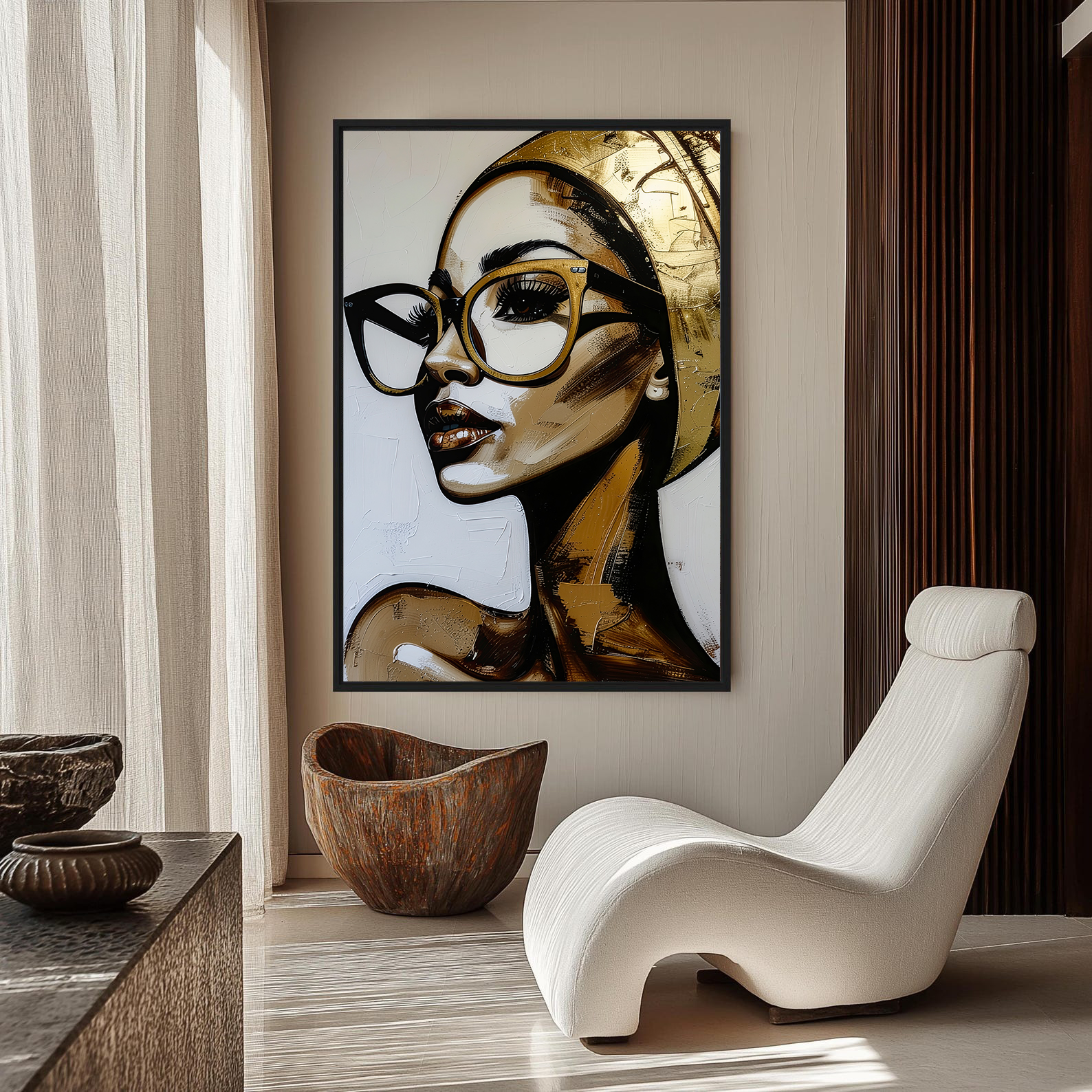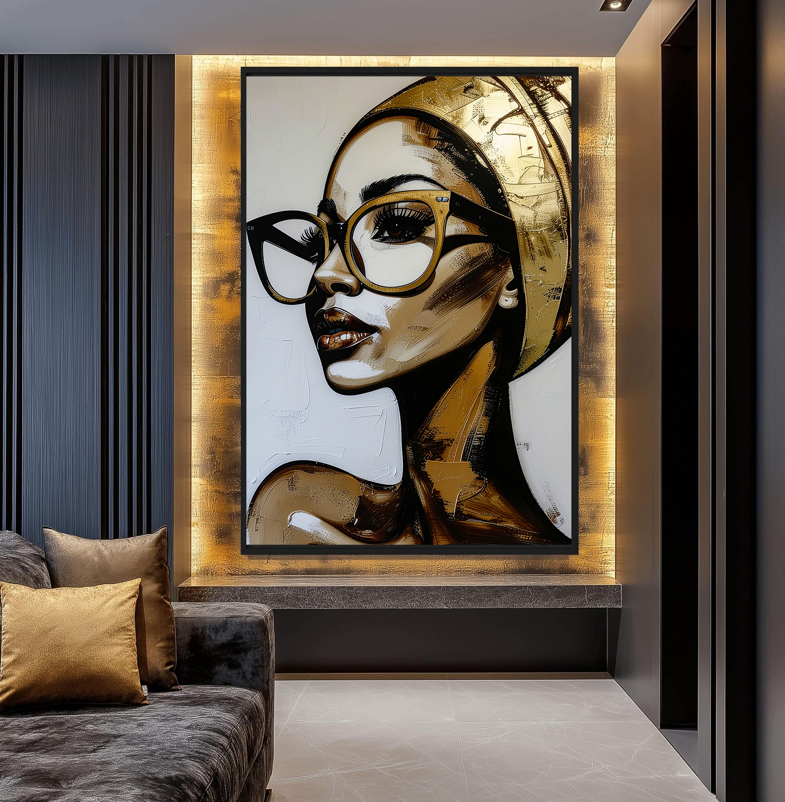 تابلو دکوراتیو بانوی طلایی | پرتره لوکس با عینک بزرگ