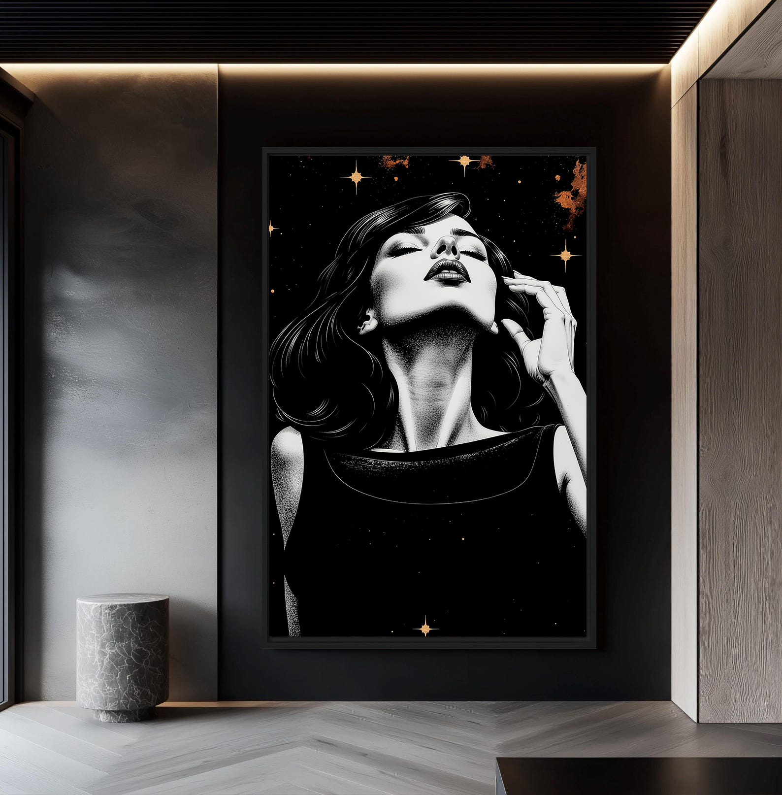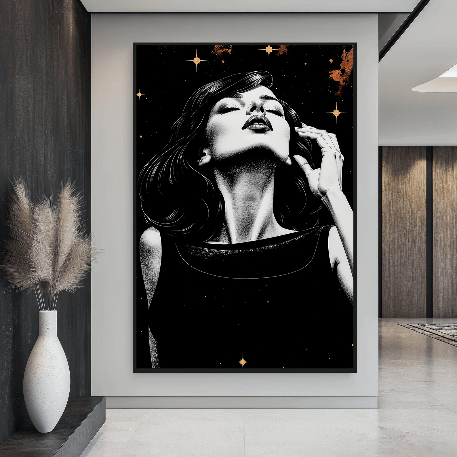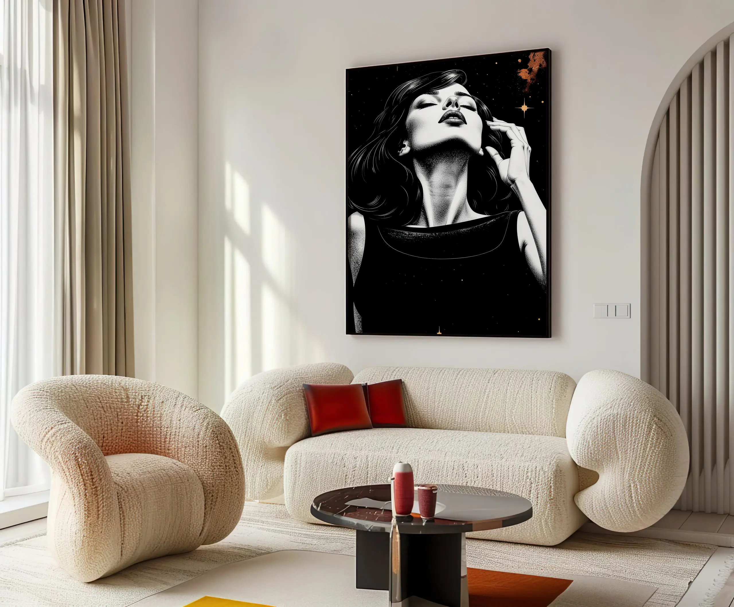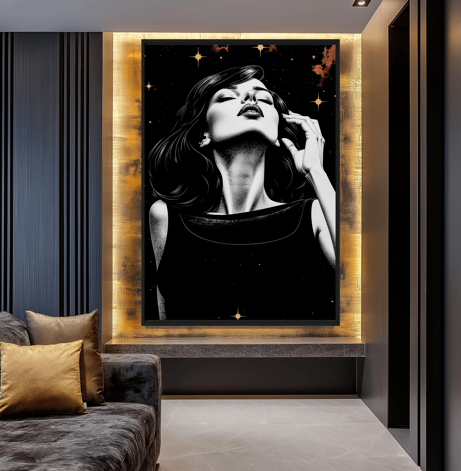 تابلو دکوراتیو بانوی کهکشان، اثری هنری عمیق و پر رمز و راز که ترکیبی از زیبایی زنانه، قدرت و رمز و راز کیهان است. این پرتره باشکوه، بانویی را در حالتی رویایی در پسزمینهای کاملاً مشکی که با ستارگان طلایی تزئین شده، به تصویر میکشد. کنتراست شدید مونوکروم (سیاه و سفید) و جزئیات طلایی، این تابلو را به انتخابی استثنایی برای فضاهای لوکس، نئوکلاسیک و مدرن تبدیل کرده که نیاز به یک نقطه کانونی پرمعنا و گیرا دارند.