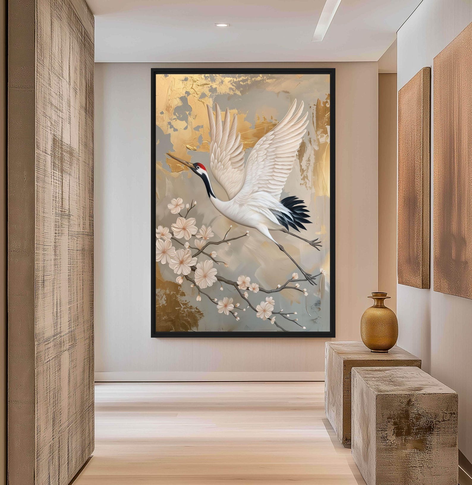 تابلو دکوراتیو درنا طلایی، اثری مجلل و پرمعنا که نماد سعادت، عمر طولانی و خوشبختی در فرهنگهای شرقی است. تصویر پرنده باشکوه درنا (Crane) در حال پرواز از میان شکوفههای گیلاس بر روی یک پسزمینه آبستره خاکستری و طلایی، حسی از آرامش، وقار و تجمل را به فضا میبخشد. این تابلو یک انتخاب ایدهآل برای فضاهای نئوکلاسیک، لوکس و مدرن است.