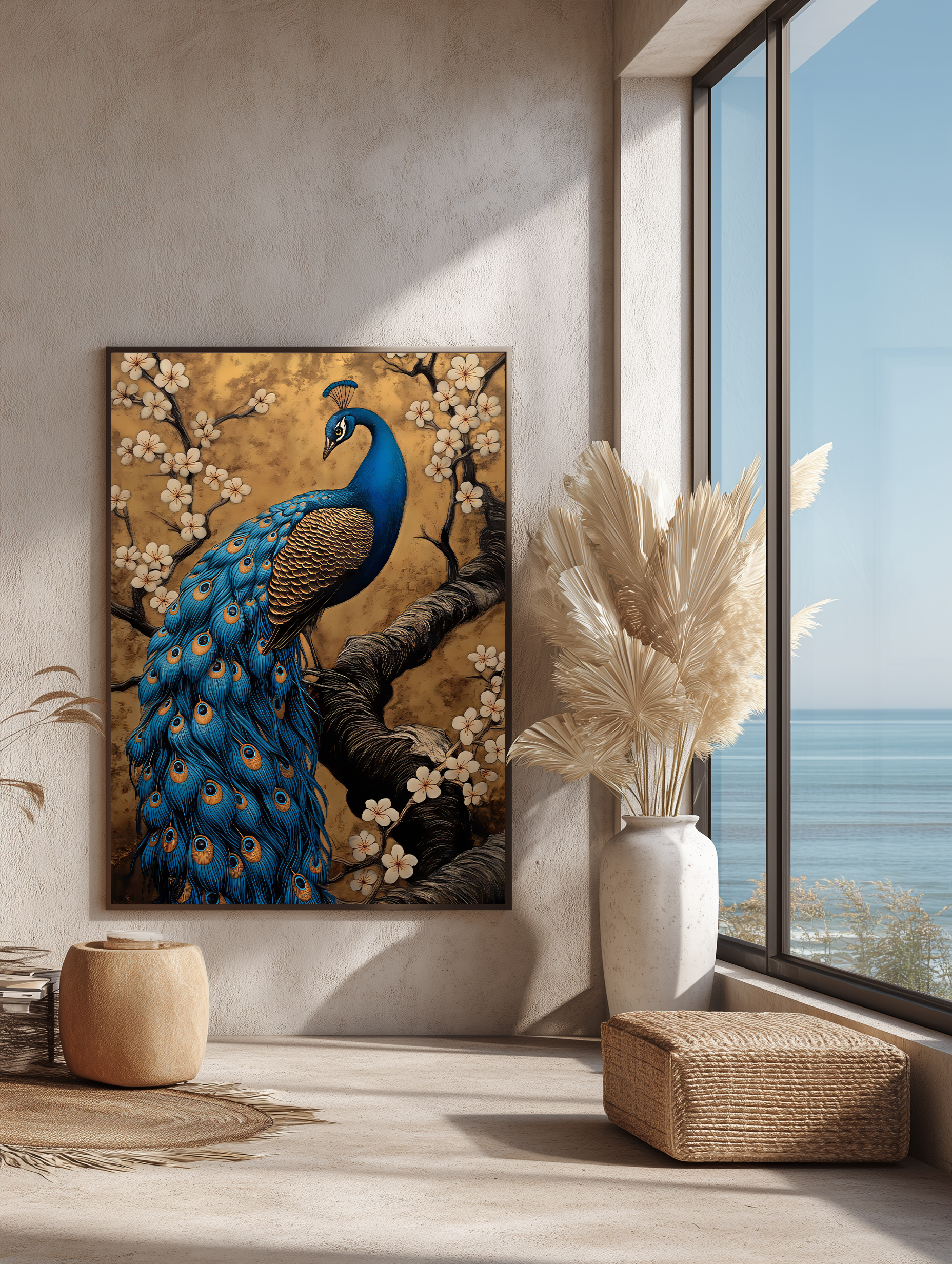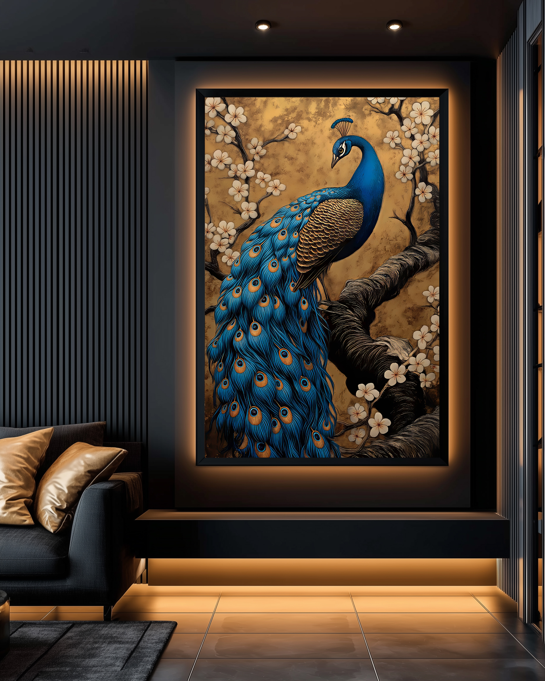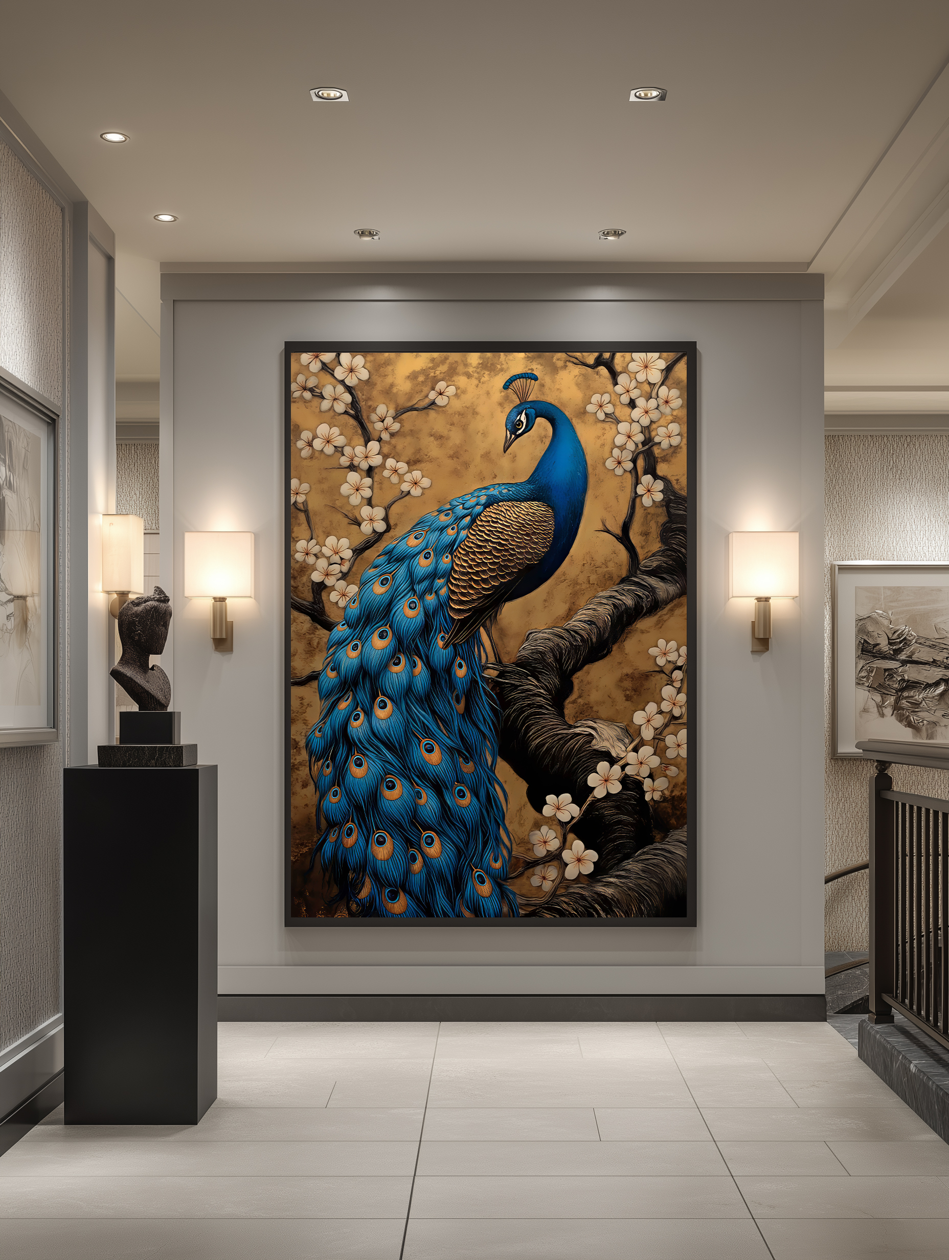 چاپ سیلک برای عمق رنگ: کاغذ سیلک (Silk) عکاسی به کار رفته در این تابلو، عمق و درخشش رنگ آبی طاووس و طلایی پسزمینه را به نحو احسن نمایش میدهد و مقاومتی عالی در برابر هرگونه آسیب دارد.