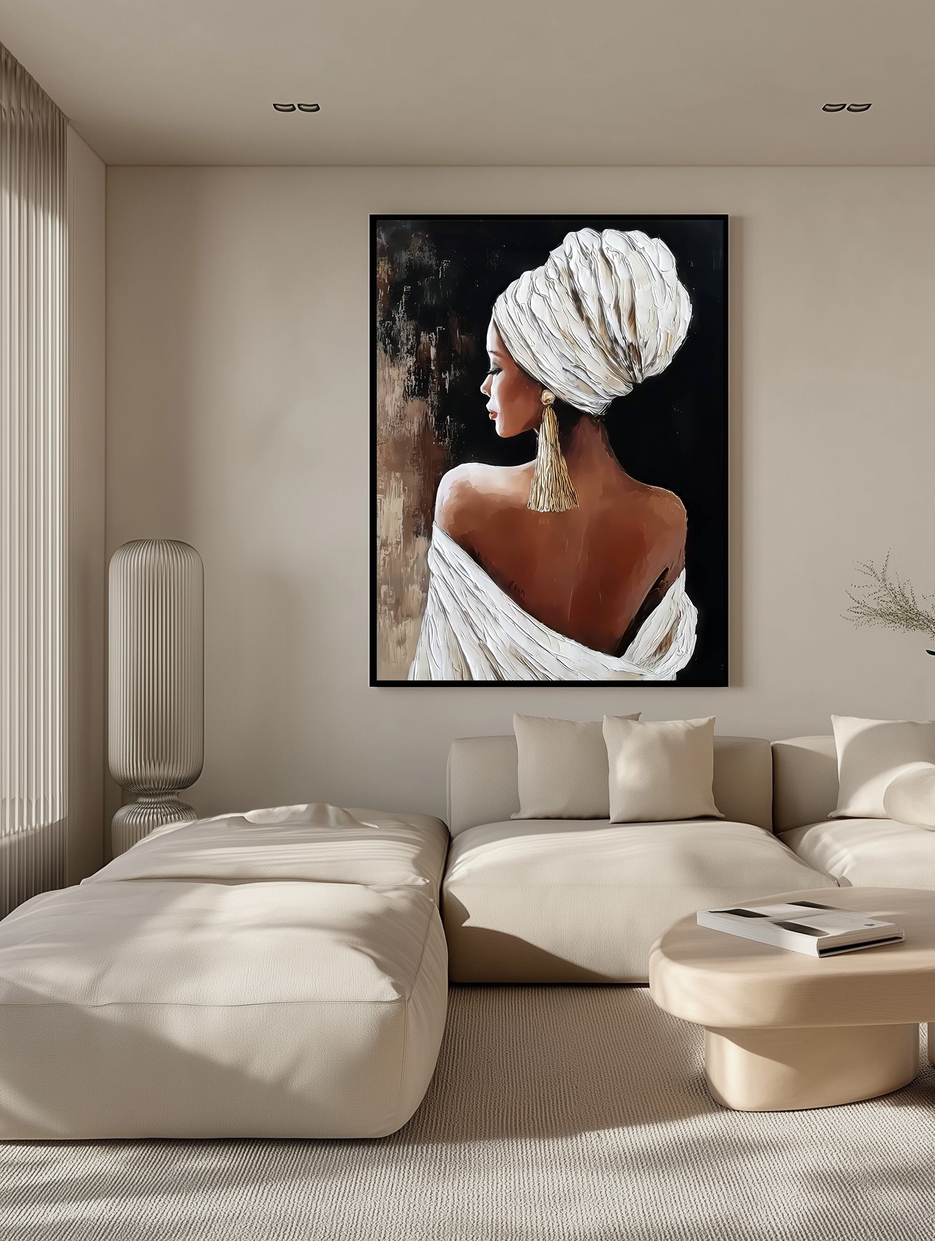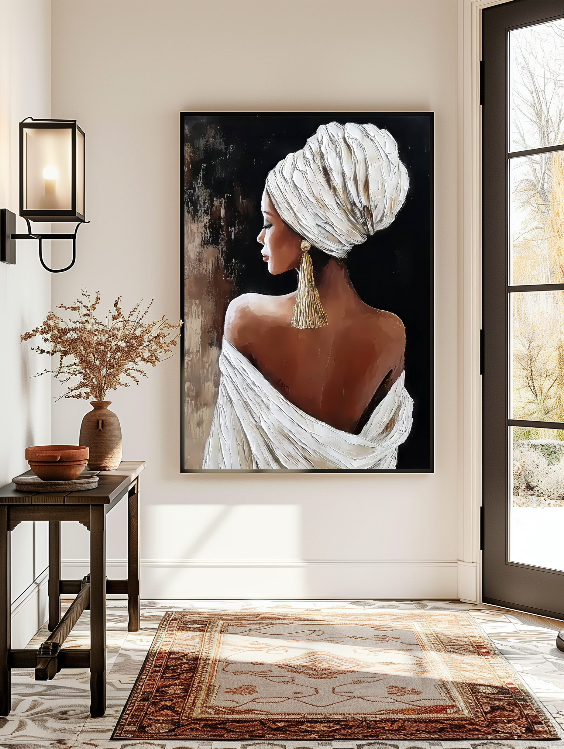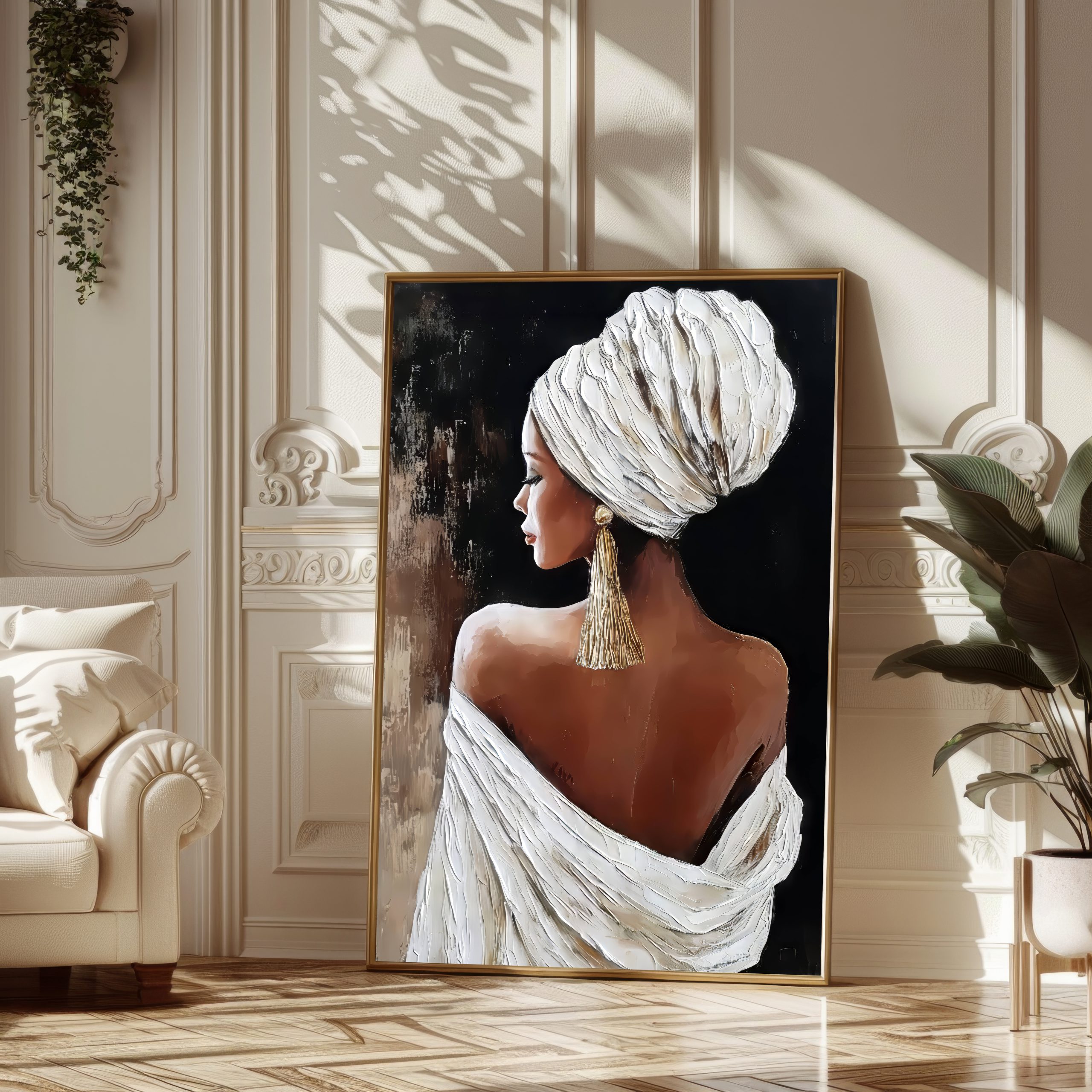 تابلو دکوراتیو مدرن بانوی افریقایی با توربان سفید این اثر خیرهکننده، یک پرتره مدرن و آبستره است که با ترکیب رنگهای گرم پوست و کنتراست عمیق پسزمینه سیاه، جلوهای دراماتیک و لوکس به فضای شما میبخشد. بافتهای قوی و برجسته (Impasto Style) در این تابلو، عمق و احساس واقعی یک نقاشی دستساز را منتقل میکند و آن را تبدیل به نقطهعطف هر دکوراسیونی میکند.