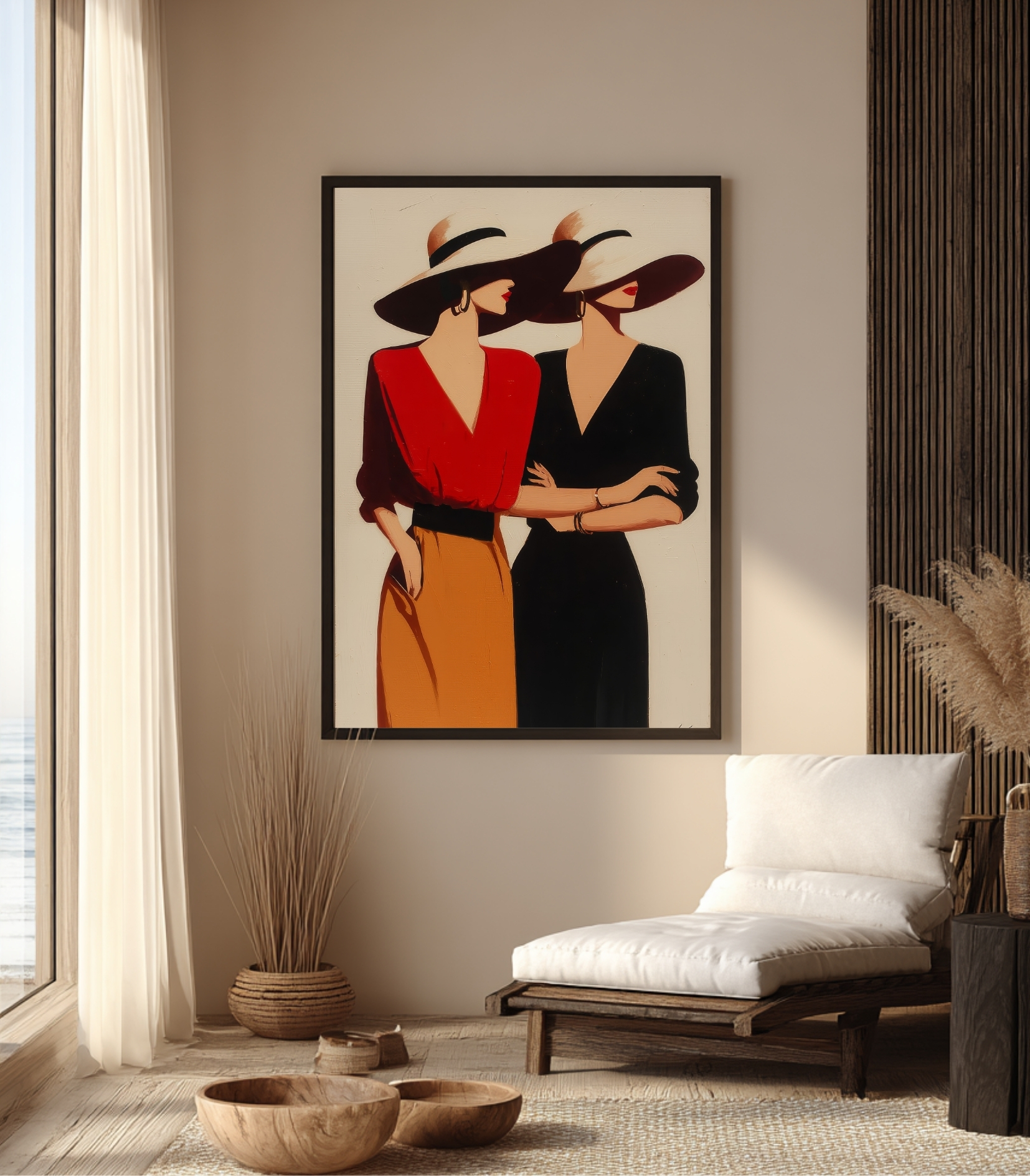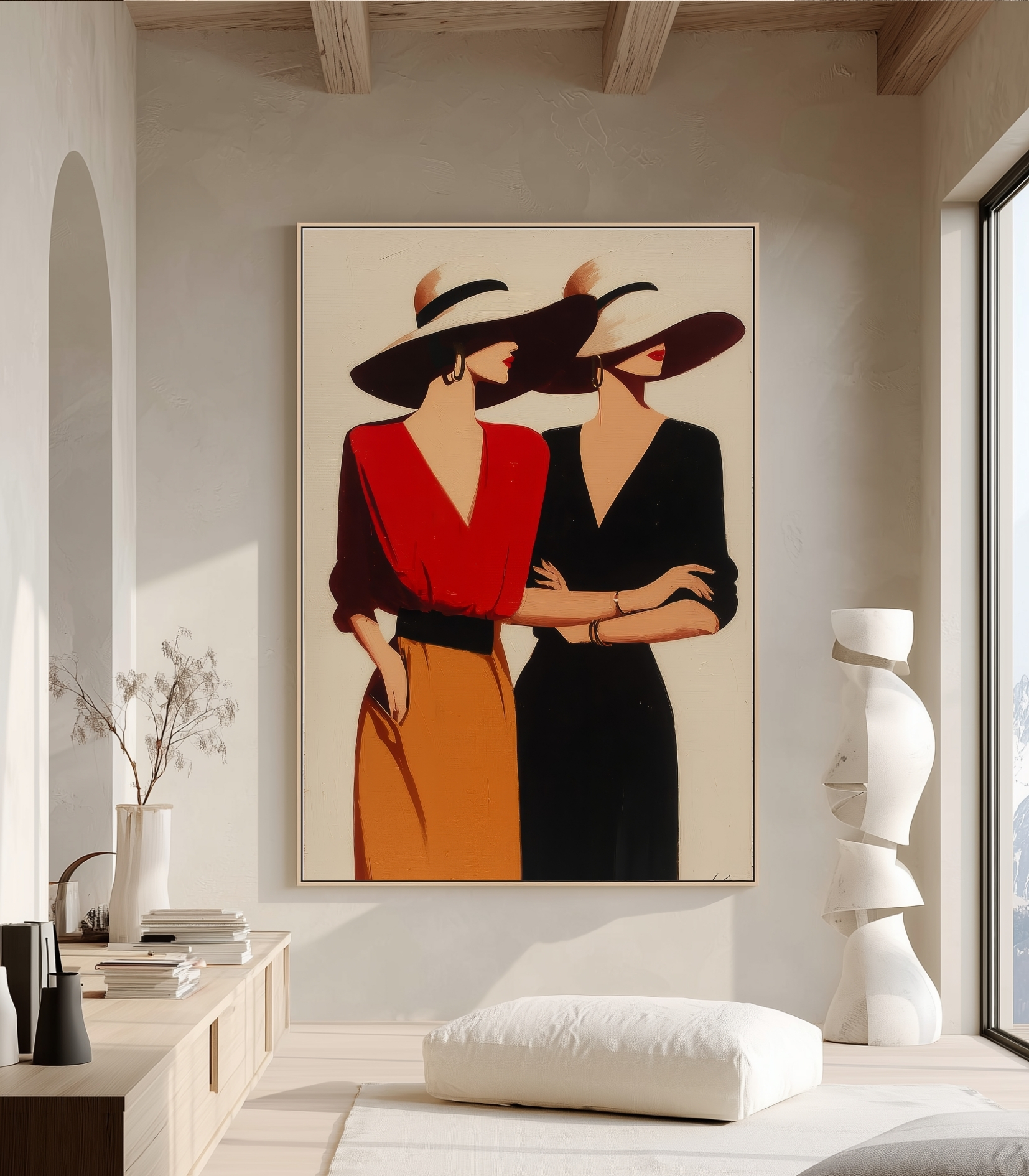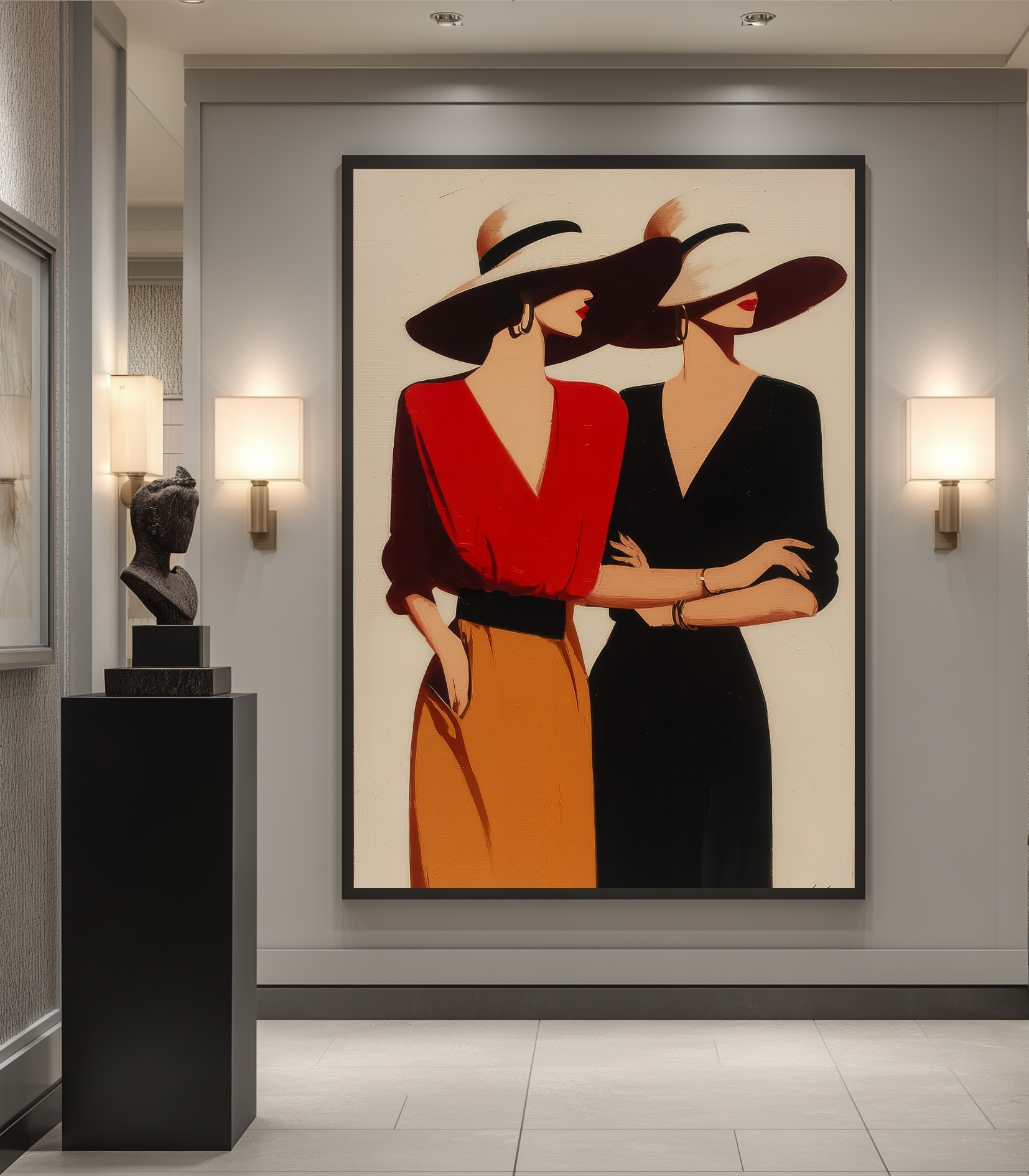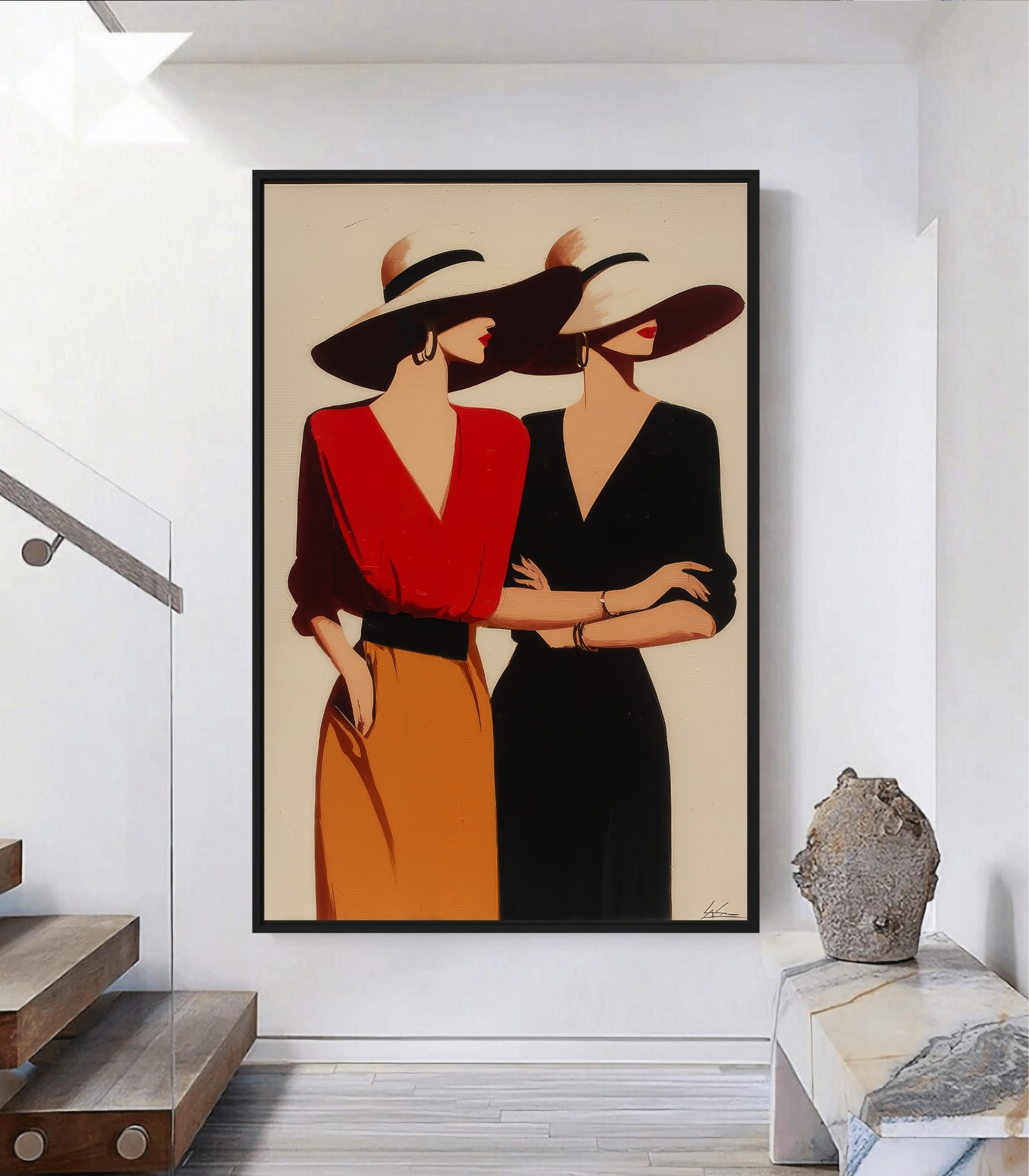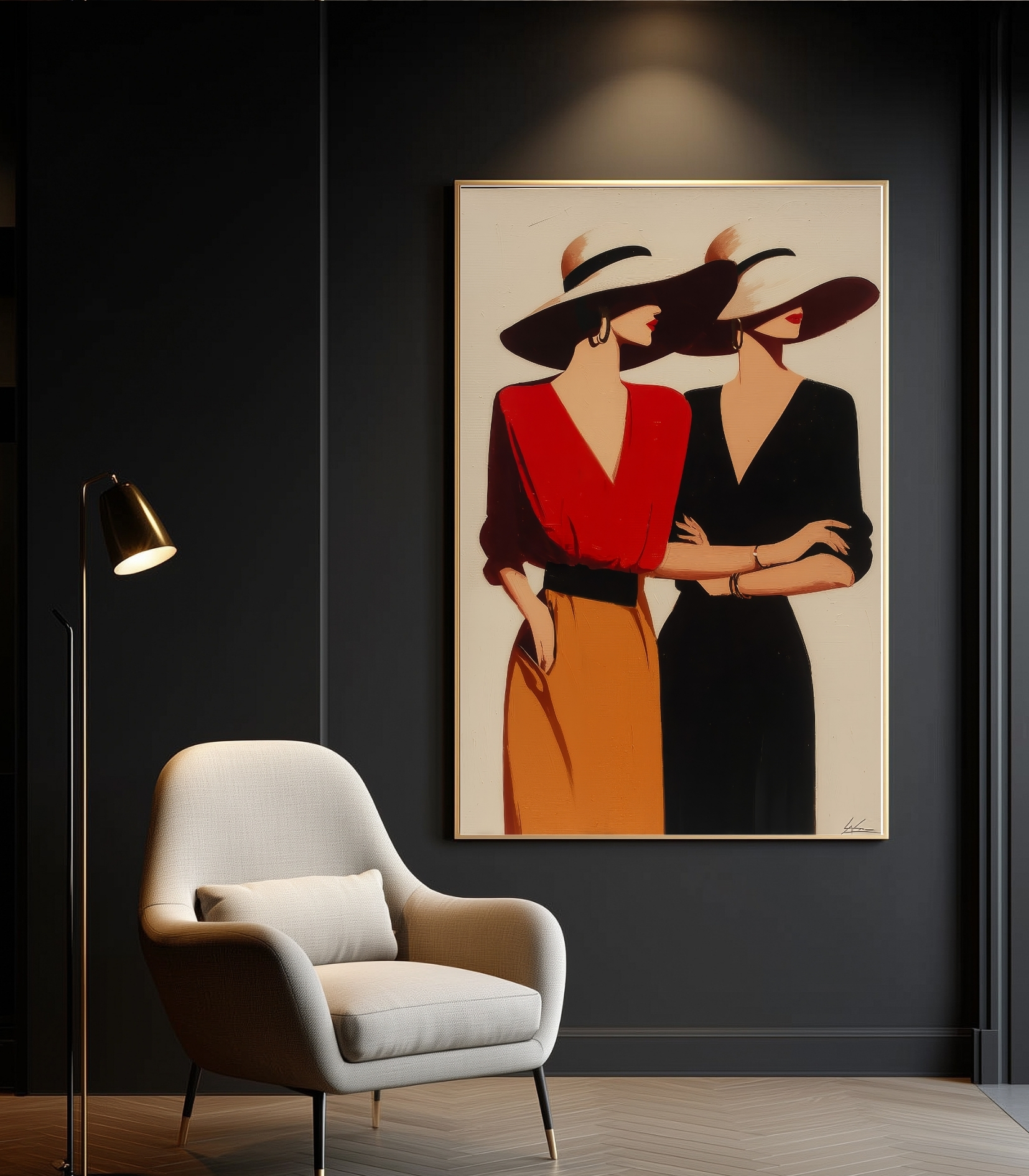 تابلو دکوراتیو مدرن طرح بانوان کلاهپوش انتخابی بینظیر است. این اثر با به تصویر کشیدن دو بانوی شیکپوش با کلاههای لبهدار و لباسهایی با رنگهای مکمل (قرمز آتشین، خردلی و مشکی)، حسی از اعتماد به نفس، زیبایی و وقار را به محیط شما منتقل میکند. سبک این تابلو ترکیبی از هنر مدرن و تصویرسازی فشن است که با دکوراسیونهای امروزی همخوانی فوقالعادهای دارد.