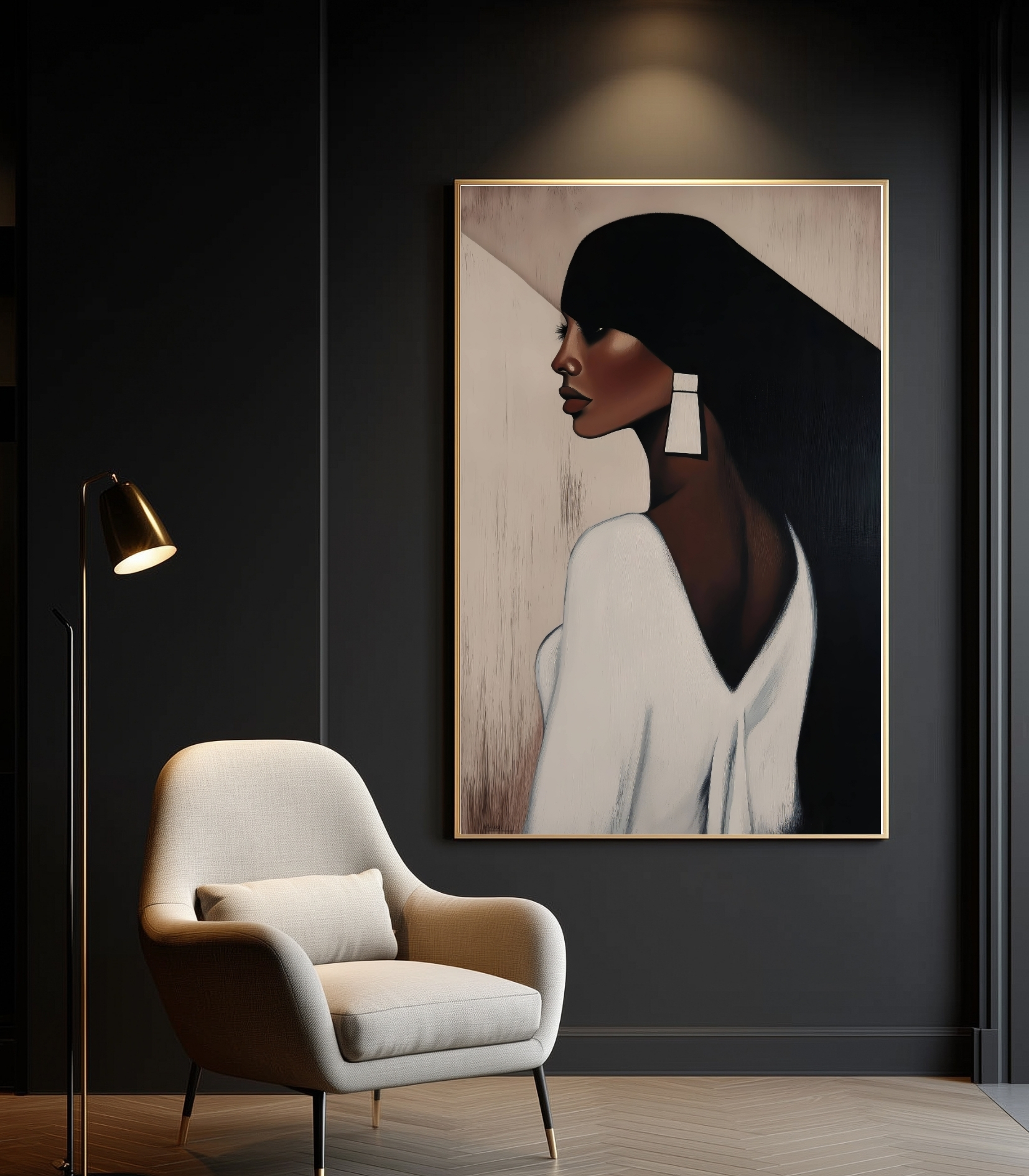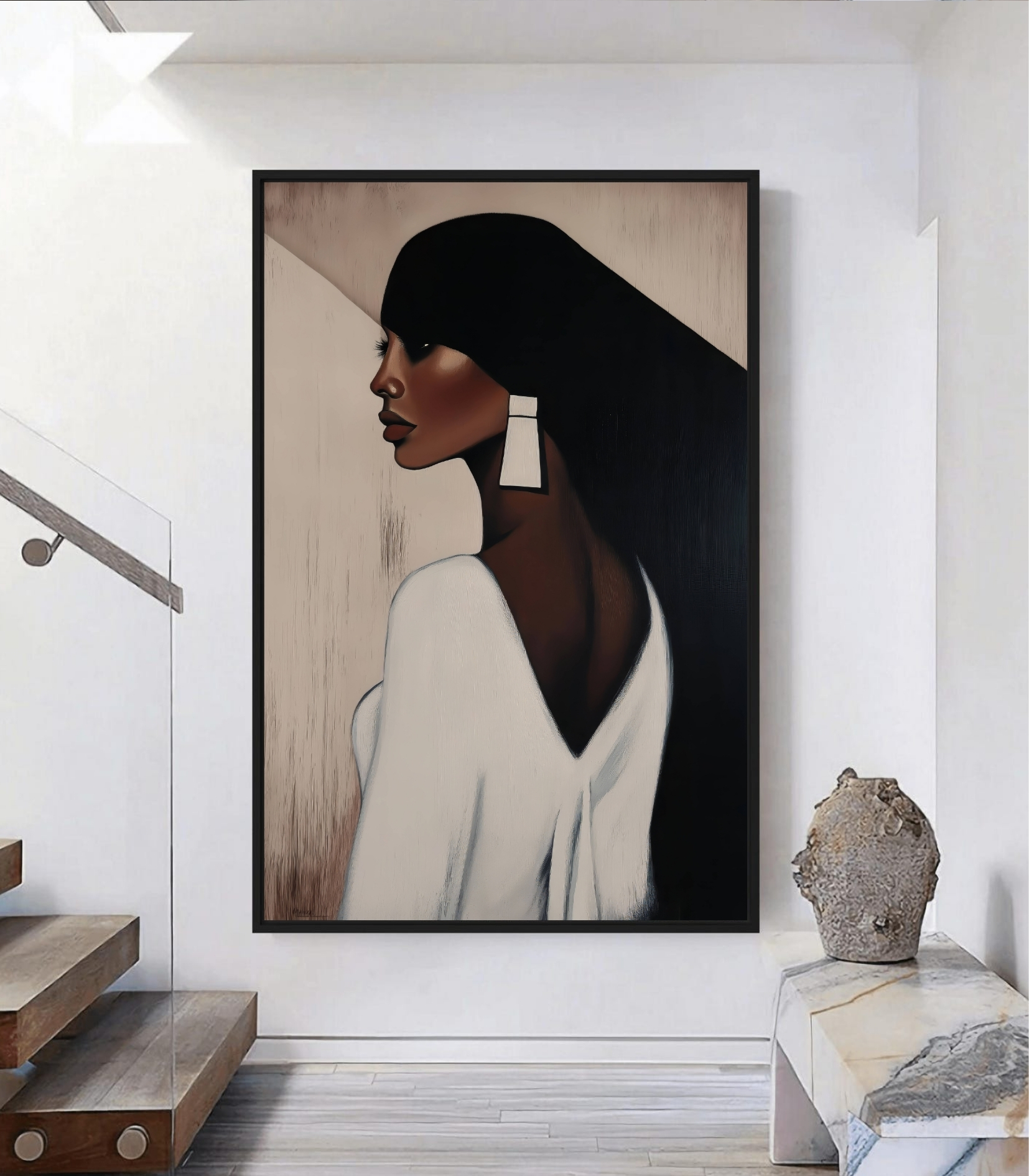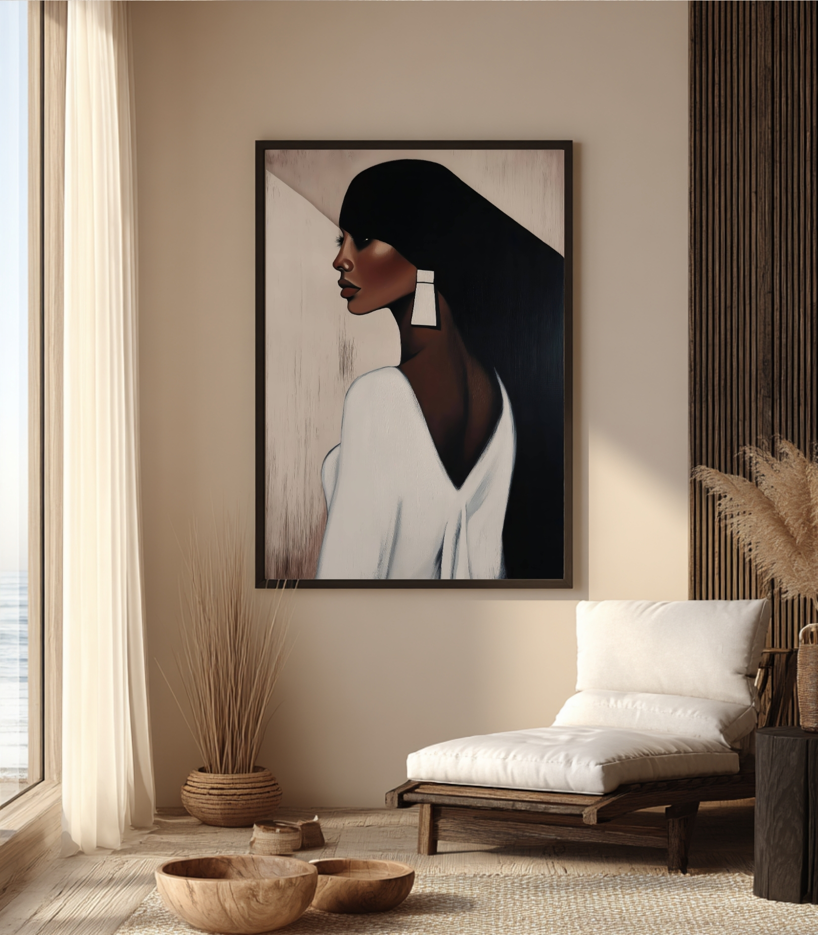 تابلو دکوراتیو مدرن طرح چهره زن ، با به تصویر کشیدن نیمرخ یک بانوی زیبا و باوقار، آرامش و ظرافت را به فضای شما می‌آورد. تضاد قدرتمند بین موهای مشکی یکدست و لباس سفید، در کنار پس‌زمینه‌ای با رنگ خنثی و بافت ملایم، ترکیبی هنرمندانه و چشم‌نواز خلق کرده است. این اثر هنری برای فضاهایی با دکوراسیون مدرن، مینیمال، بوهمین و اسکاندیناوی ایده‌آل است و به زیبایی با دیوارهای روشن، مبلمان کرم و عناصر چوبی هماهنگ می‌شود.