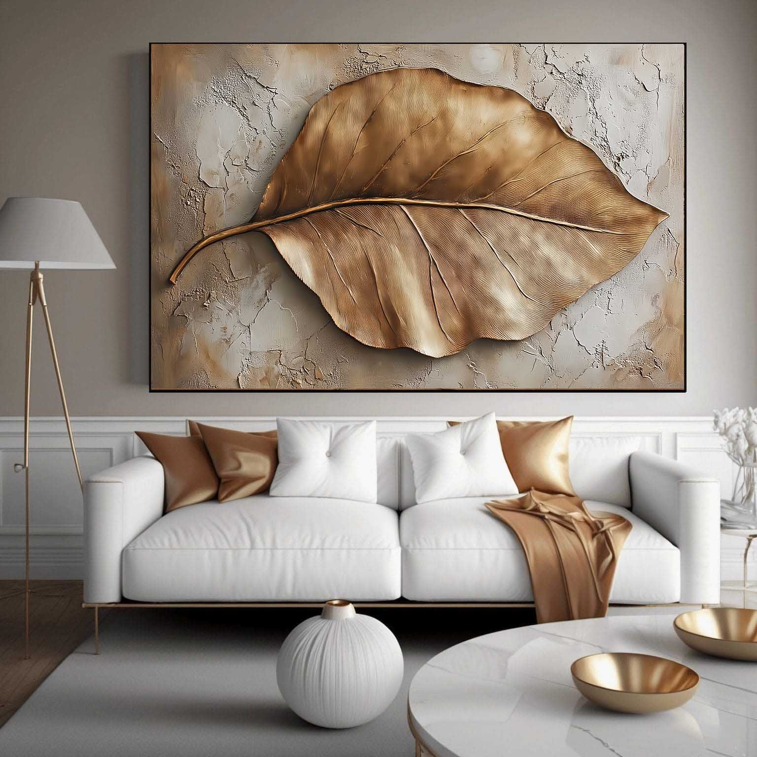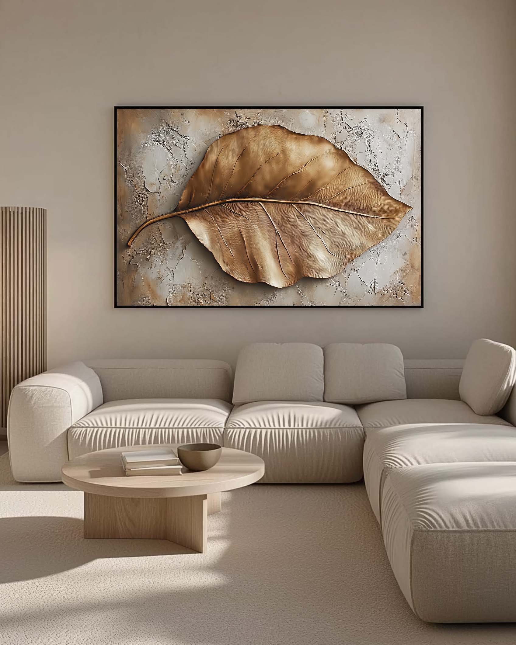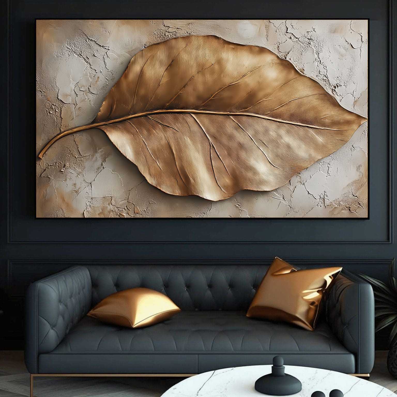 طبیعت را با روکشی از تجمل و هنر مدرن به خانه خود دعوت کنید. ، تصویری از یک برگ پهن و رگه‌دار با رنگ طلایی آنتیک است که بر روی بستری شبیه به سنگ یا بتن ترک‌خورد (طوسی و کرم) قرار گرفته است. این اثر هنری با ایجاد تضاد میان “بافت خشن پس‌زمینه” و “درخشش فلزی برگ”، جلوه‌ای بسیار لوکس و در عین حال مدرن به فضای نشیمن شما می‌بخشد.