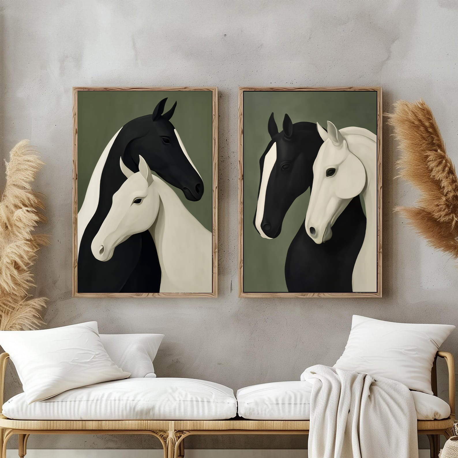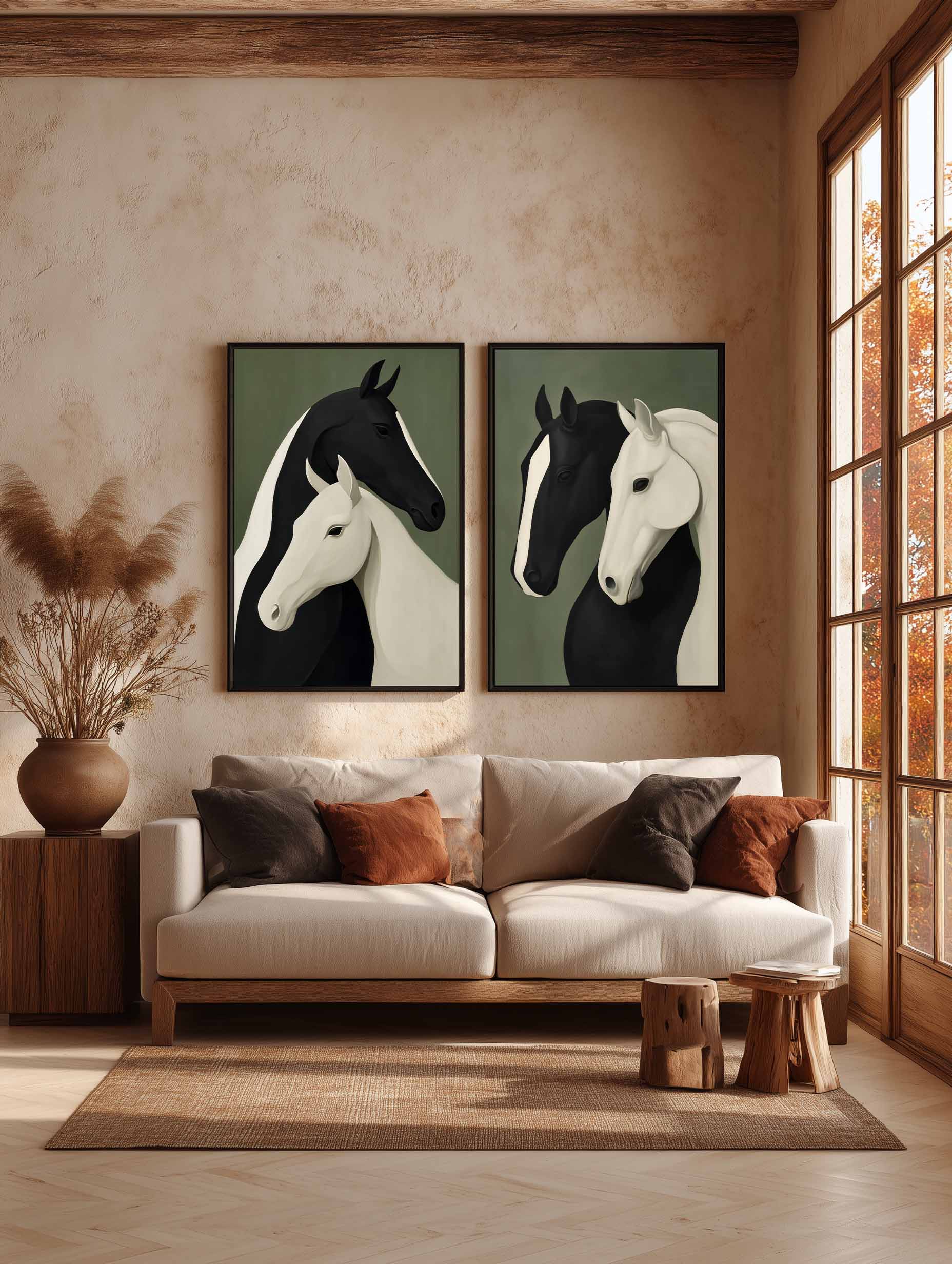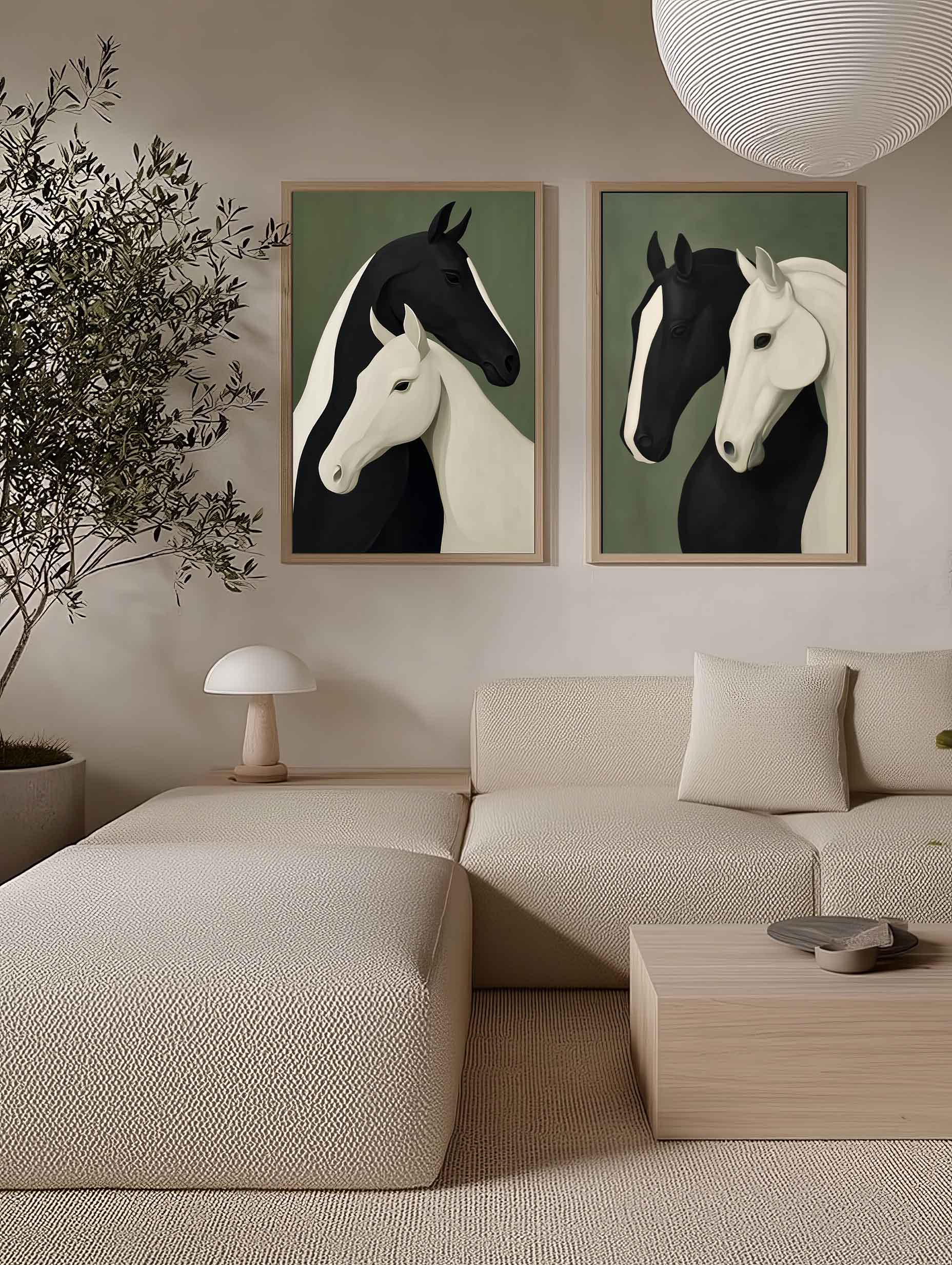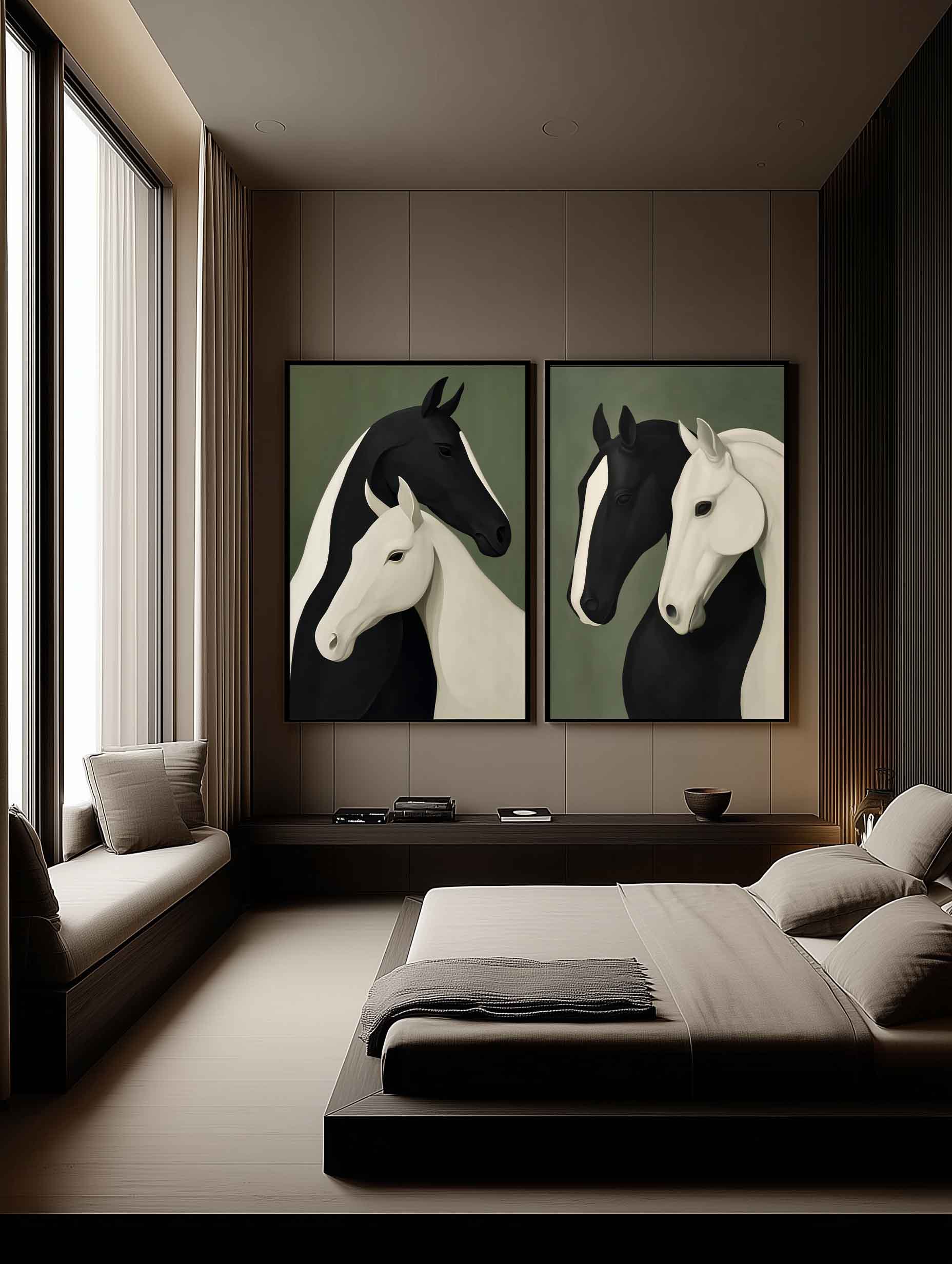تابلو دکوراتیو مینیمال اسبهای سیاه و سفید | دو تکه
