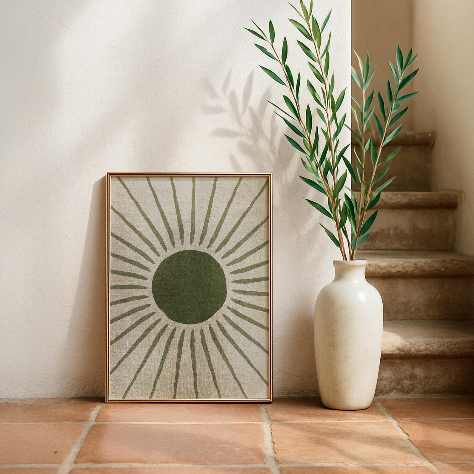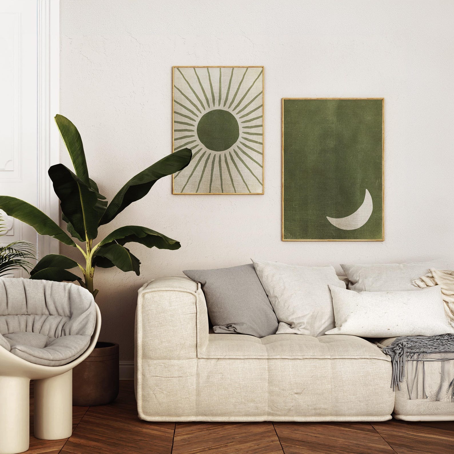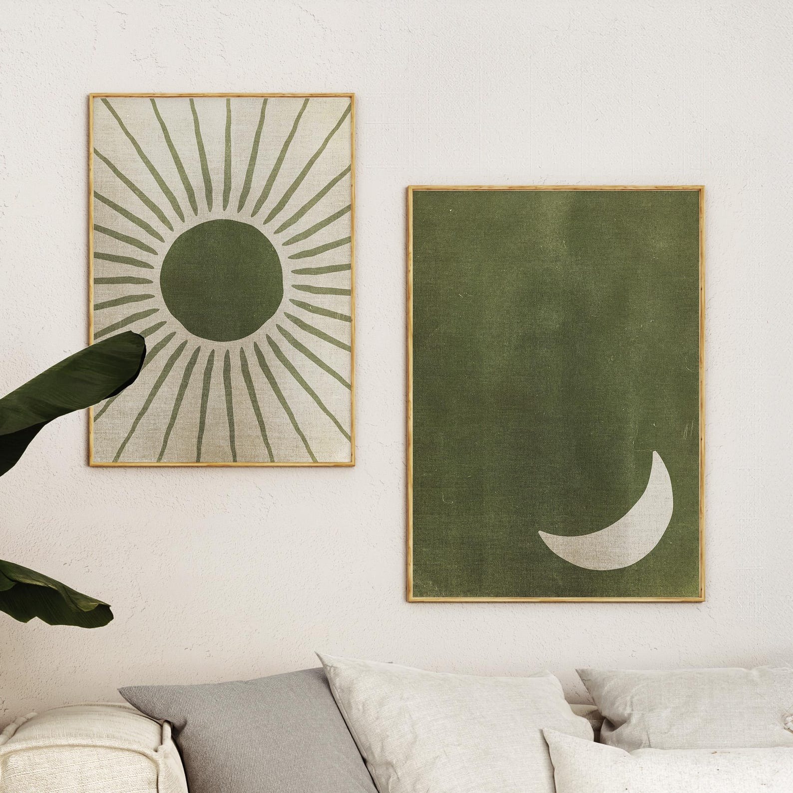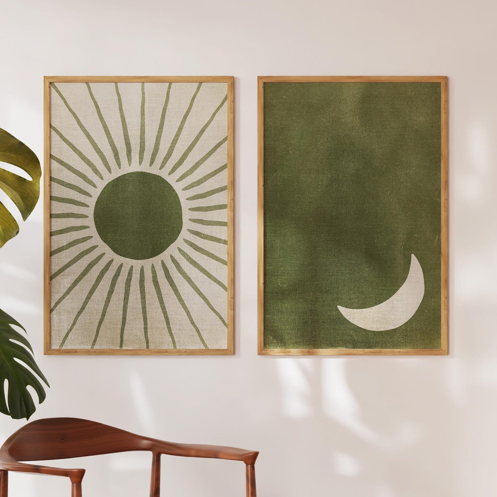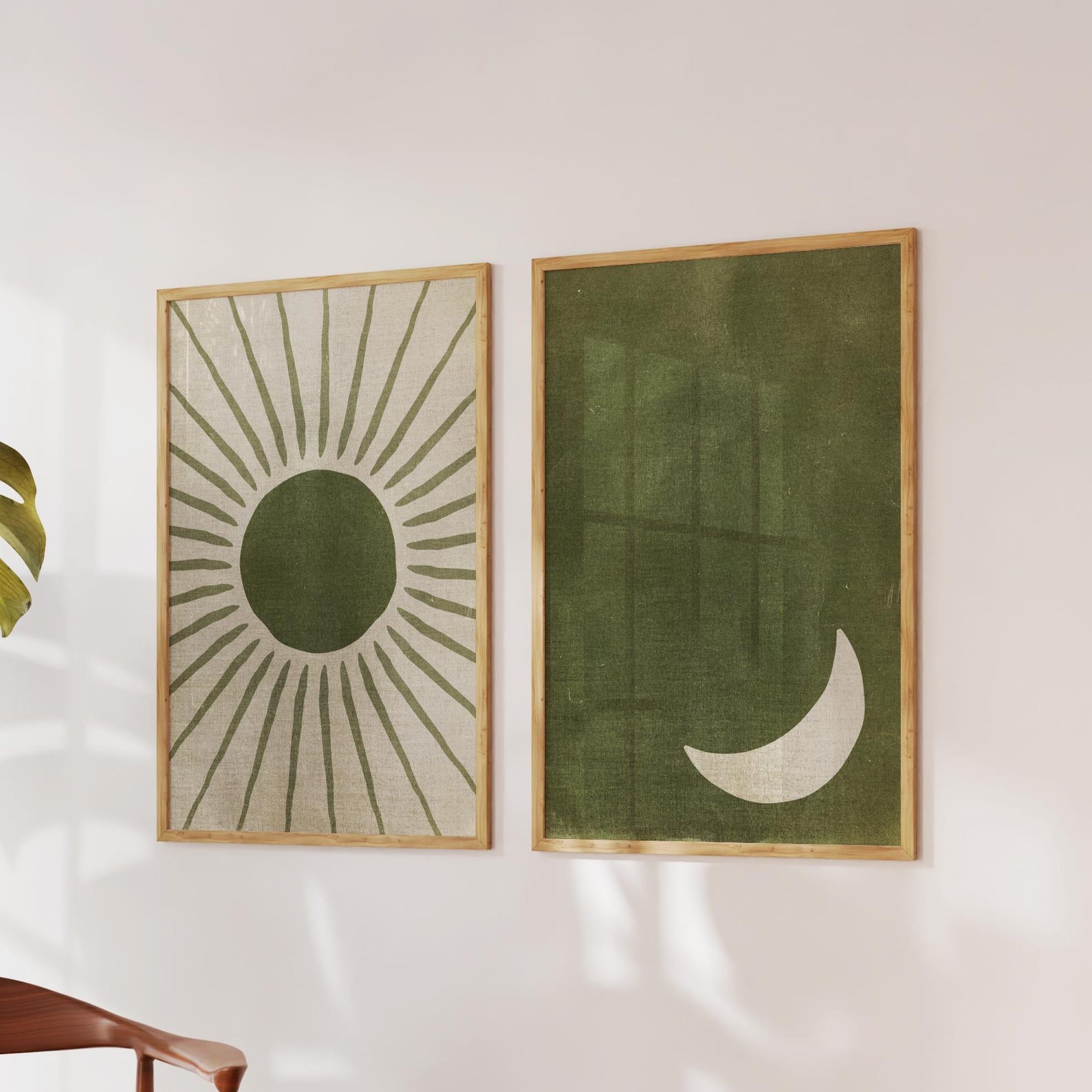 تابلو دکوراتیو مینیمال سبز و بژ، تابلو دو تکه با سادگی و عمق است که نماد تعادل، طبیعت و ریتم کیهانی است. این ست با طراحی خورشید و ماه در ترکیب با بافت شبیه به بوم گونی و رنگهای زیتونی (سبز ارتشی) و بژ خنثی، انتخابی عالی برای دکوراسیونهای مینیمال، بوهو و اسکاندیناوی است. این ست، حسی از آرامش طبیعت را به خانه یا محل کار شما میآورد.