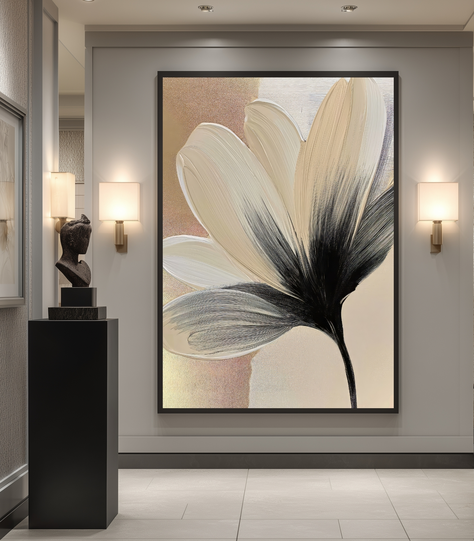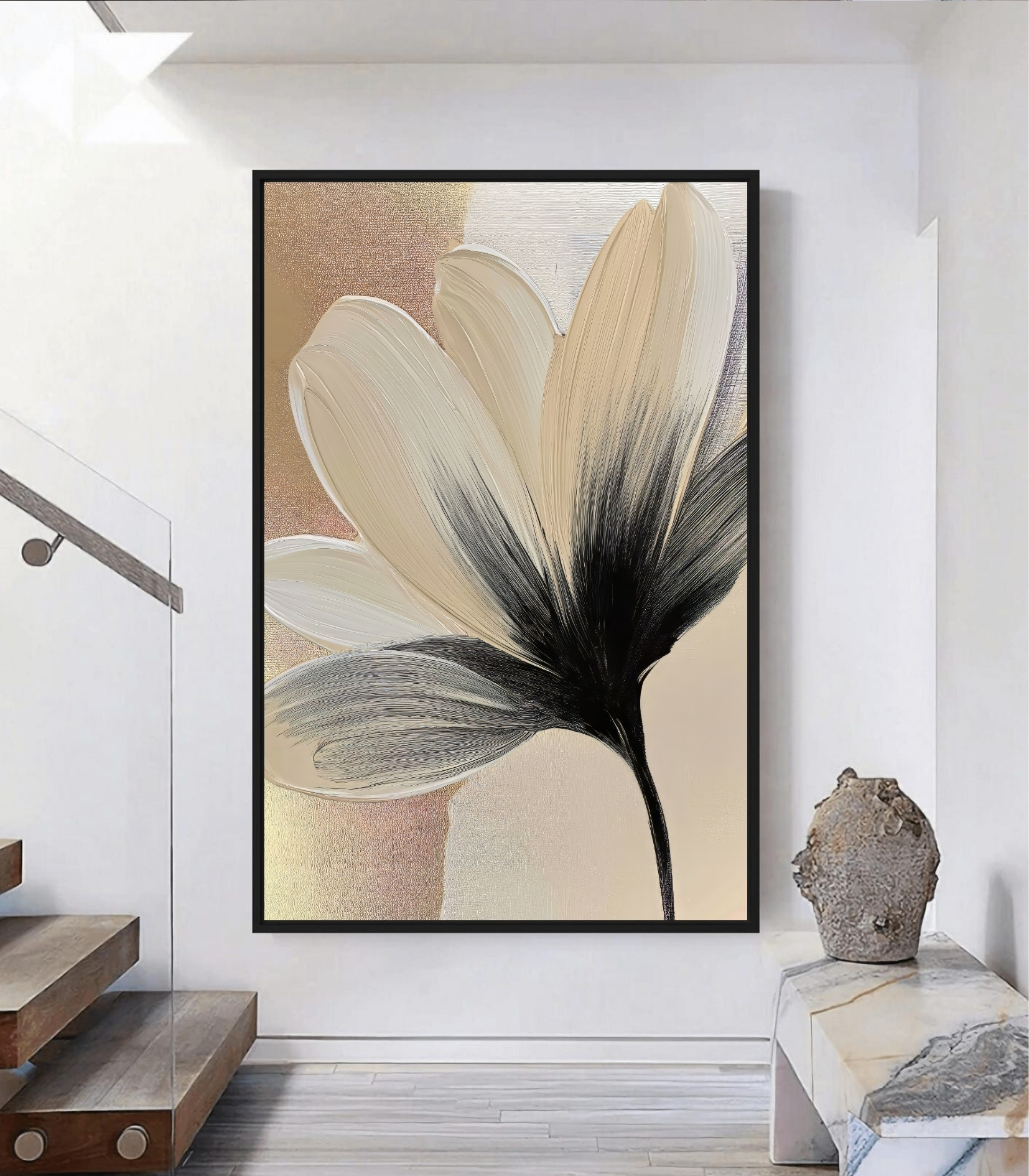 تابلو دکوراتیو مینیمال و آبستره طرح گل سادگی نهایت زیبایی است. این تابلو دکوراتیو مدرن با طرحی انتزاعی از یک گل شکفته، آرامش و لطافت را به فضای شما هدیه میدهد. استفاده از رنگهای خنثی و گرم مانند کرم، بژ، طلایی مات و کنتراست آن با سیاهی ساقه و سایهها، هارمونی بسیار شیکی ایجاد کرده است. این اثر هنری انتخابی عالی برای کسانی است که به سبکهای مینیمال و دکوراسیونهای روشن و آرام علاقه دارند و میخواهند دیواری بیآلایش اما هنرمندانه داشته باشند.