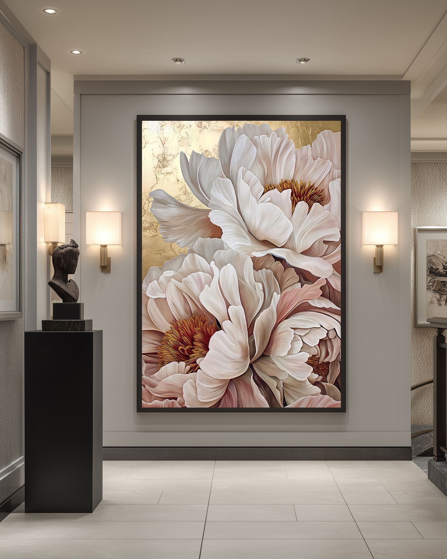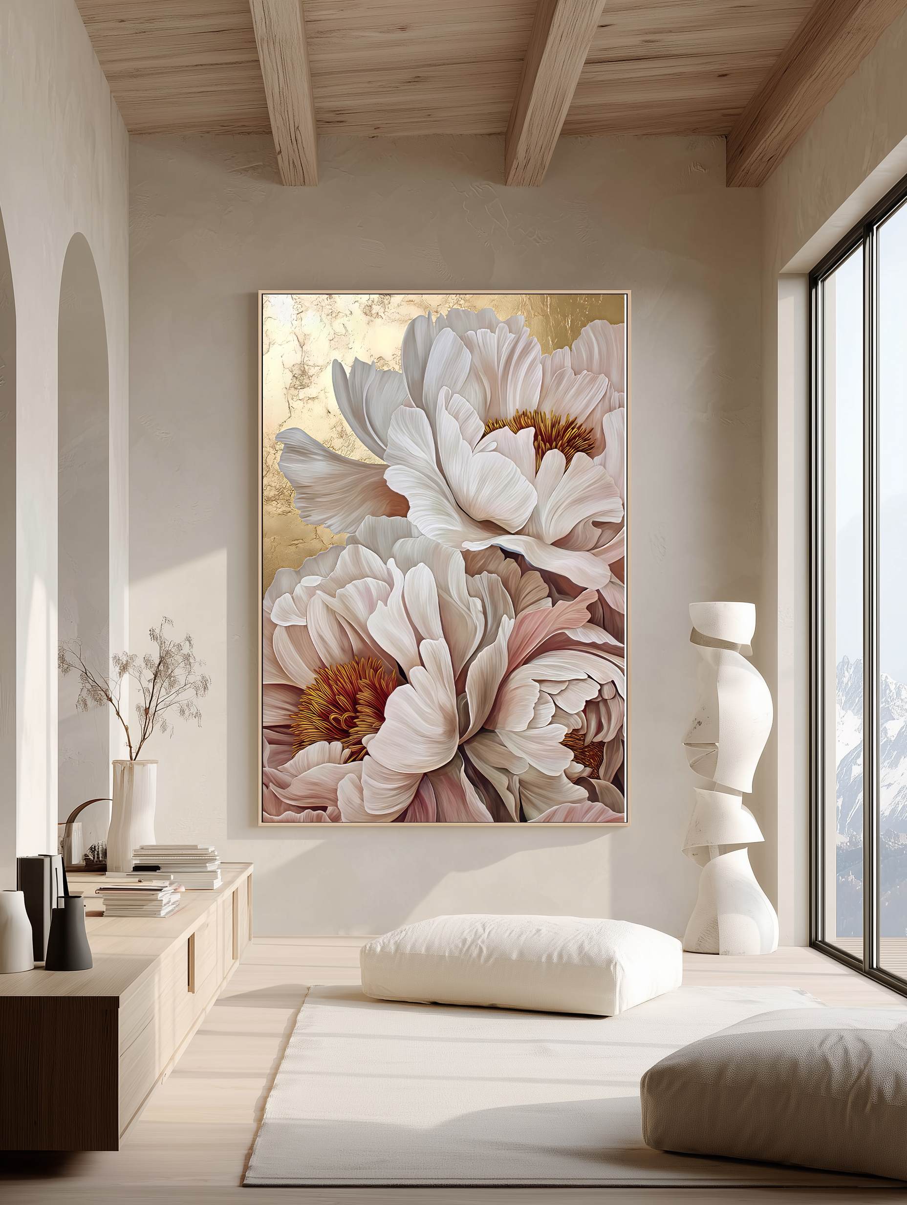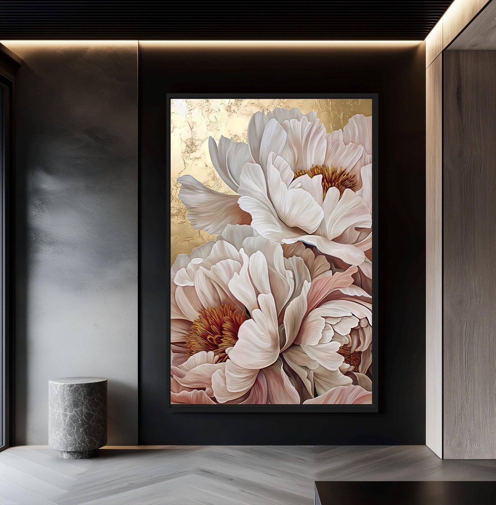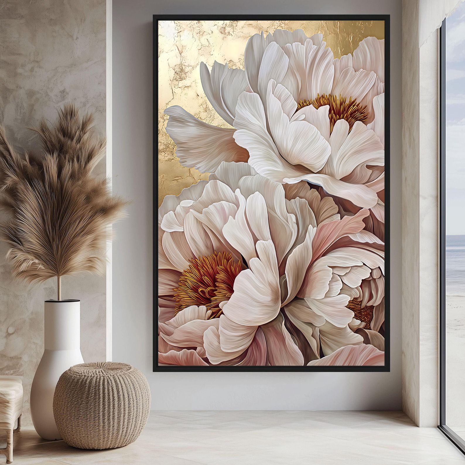 تابلو دکوراتیو گل‌های پئونی لوکس با نمایش گل‌های پئونی در ابعاد درشت و ترکیب رنگ‌های لطیف کرم، صورتی و طلایی، جلوه‌ای سرشار از ظرافت، شکوه و آرامش را به فضای داخلی منتقل می‌کند. جزئیات دقیق گلبرگ‌ها در کنار پس‌زمینه‌ی گرم و درخشان، حس لوکس و هنری خاصی ایجاد کرده که نگاه را به‌صورت ناخودآگاه به خود جذب می‌کند.