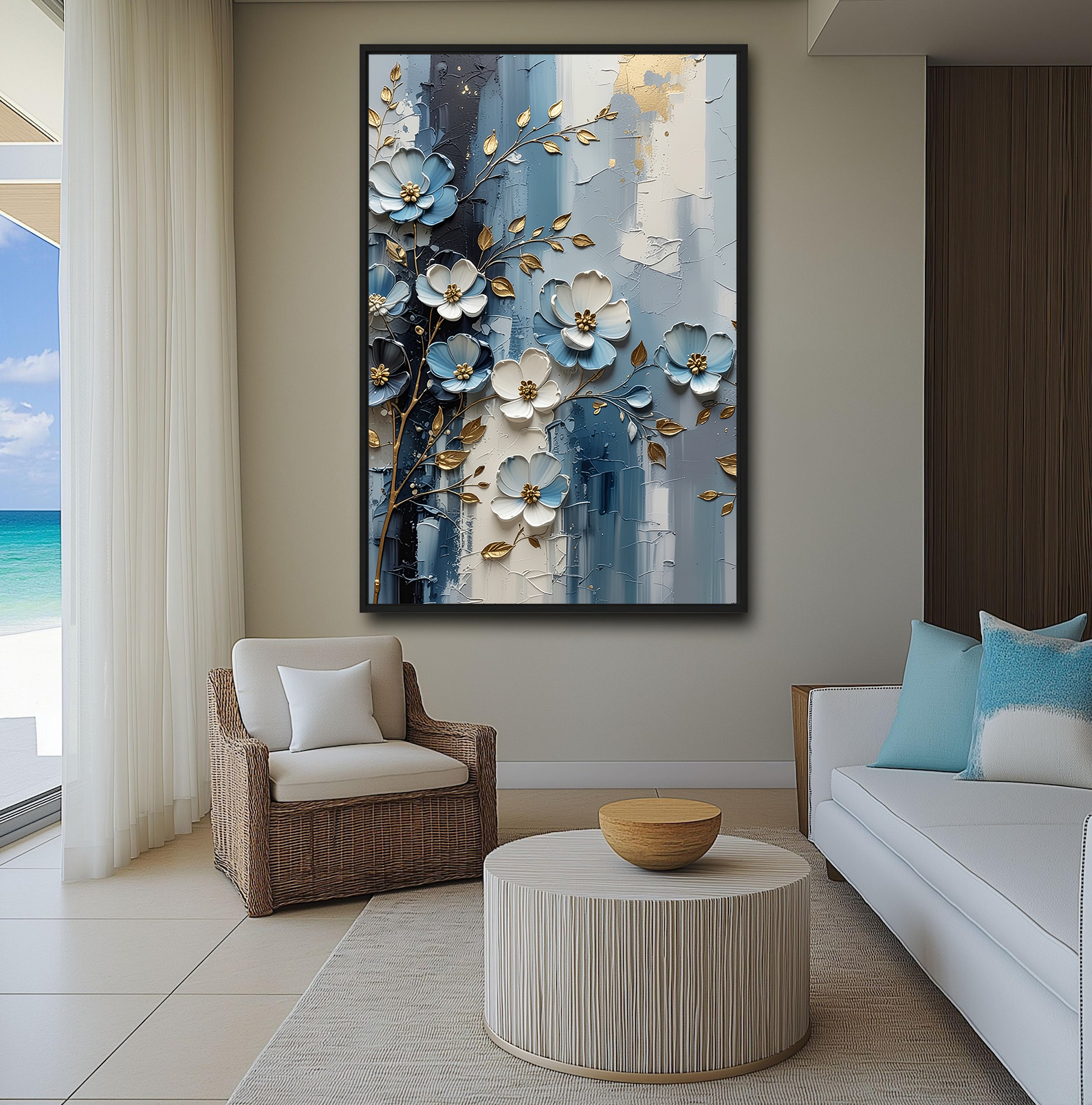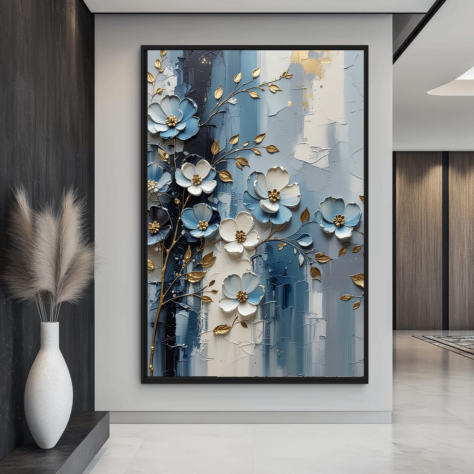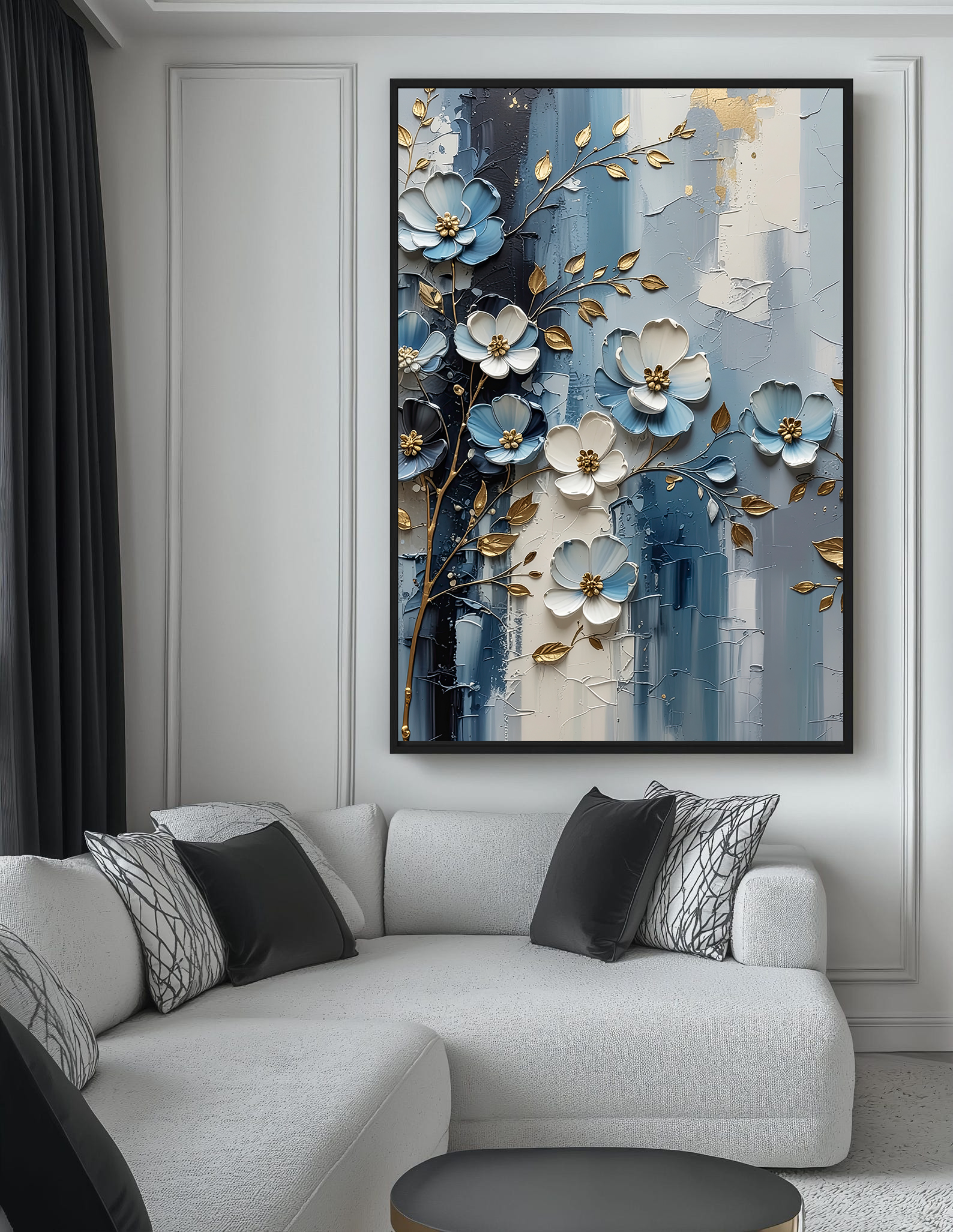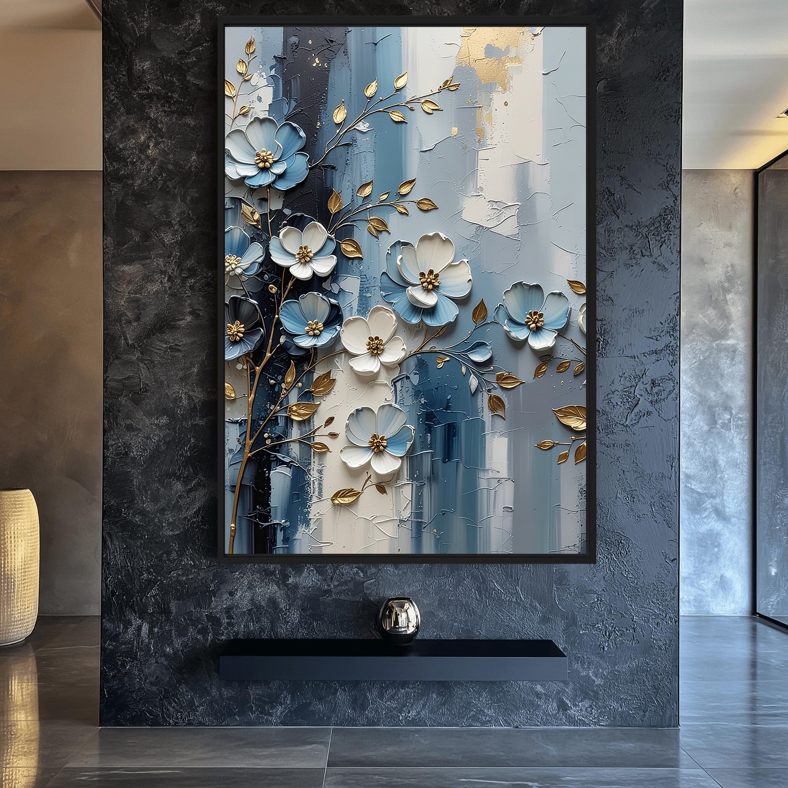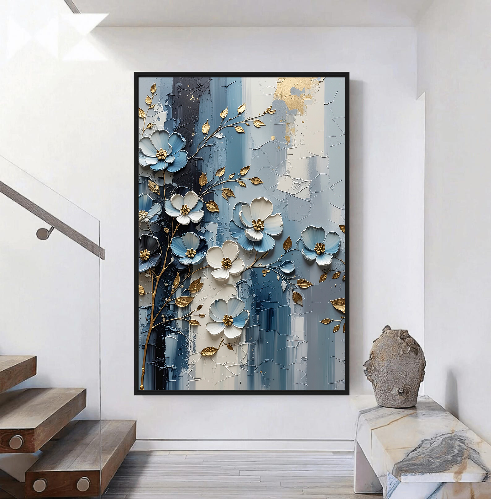 تابلو دکوراتیو شکوفه‌های طلایی زمستانی، اثری هنری و چشم‌نواز با تم آبستره مدرن و جزئیات گل‌های برجسته سه‌بعدی است. این اثر با ترکیب رنگ‌های عمیق آبی، خاکستری، سفید و درخشش خیره‌کننده رگه‌های طلایی، حسی از آرامش و لوکس بودن را به فضای شما هدیه می‌دهد. ایده‌آل برای تکمیل دکوراسیون پذیرایی، نشیمن یا اتاق خواب‌های مدرن و نئوکلاسیک.