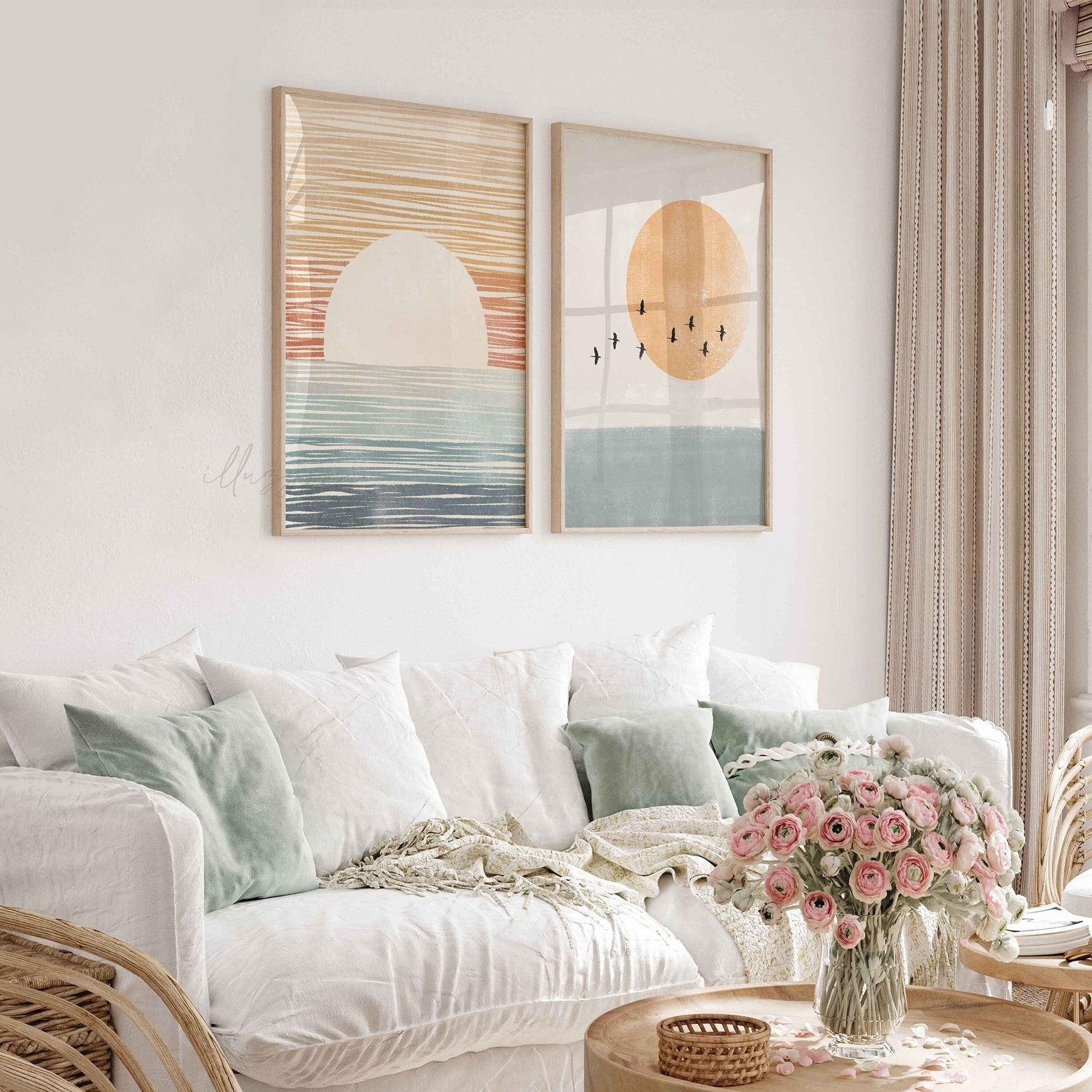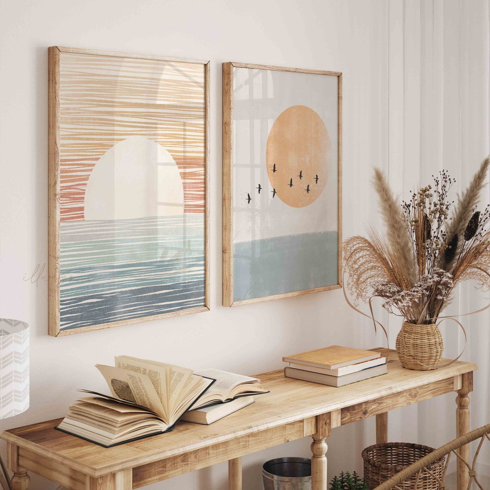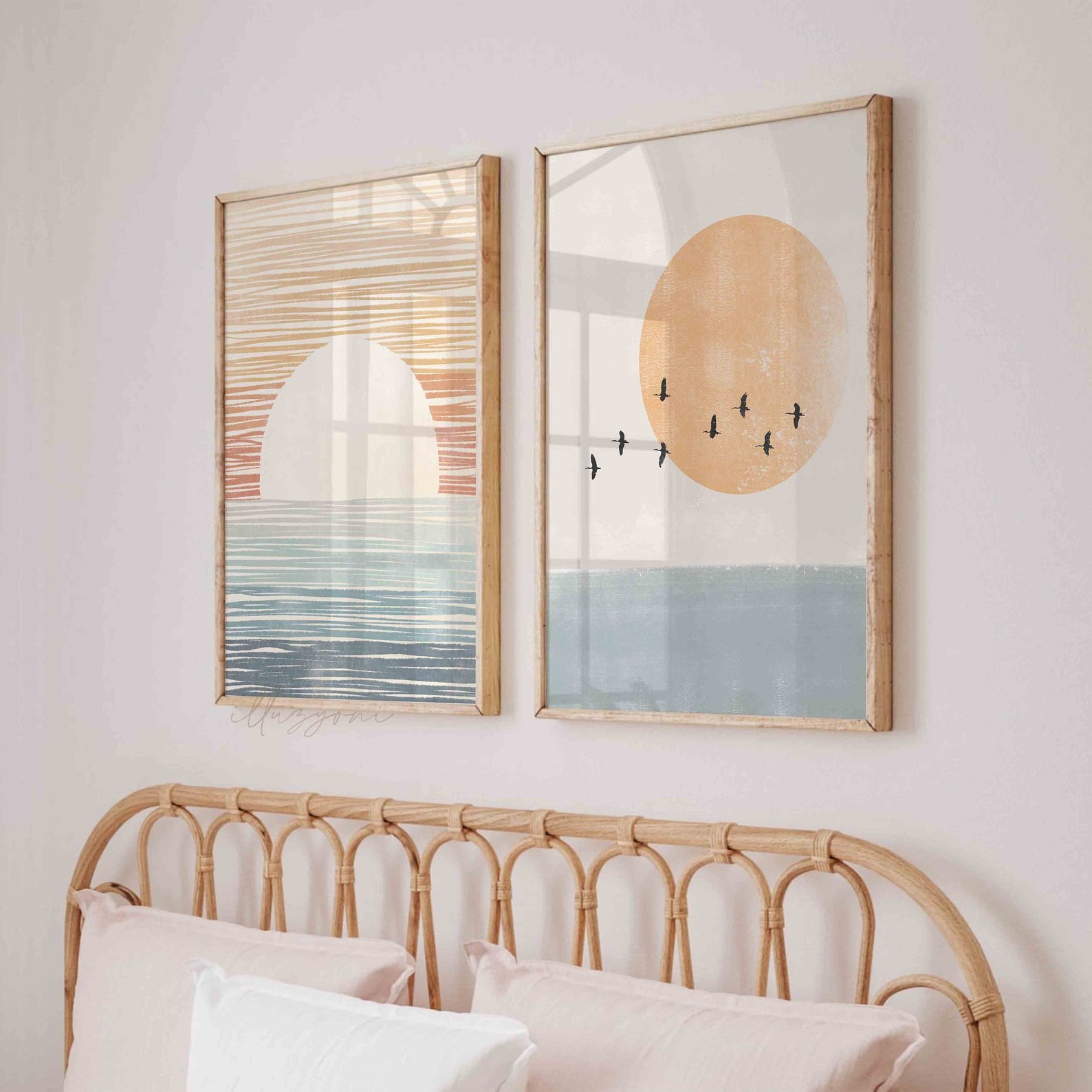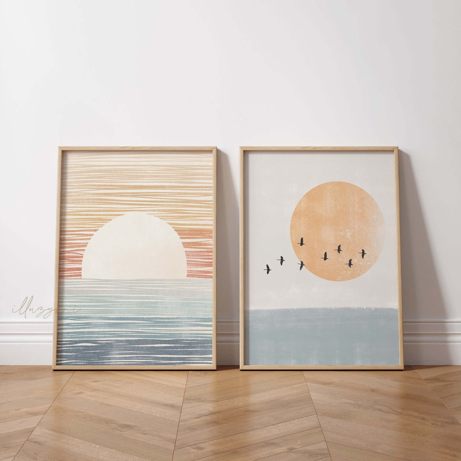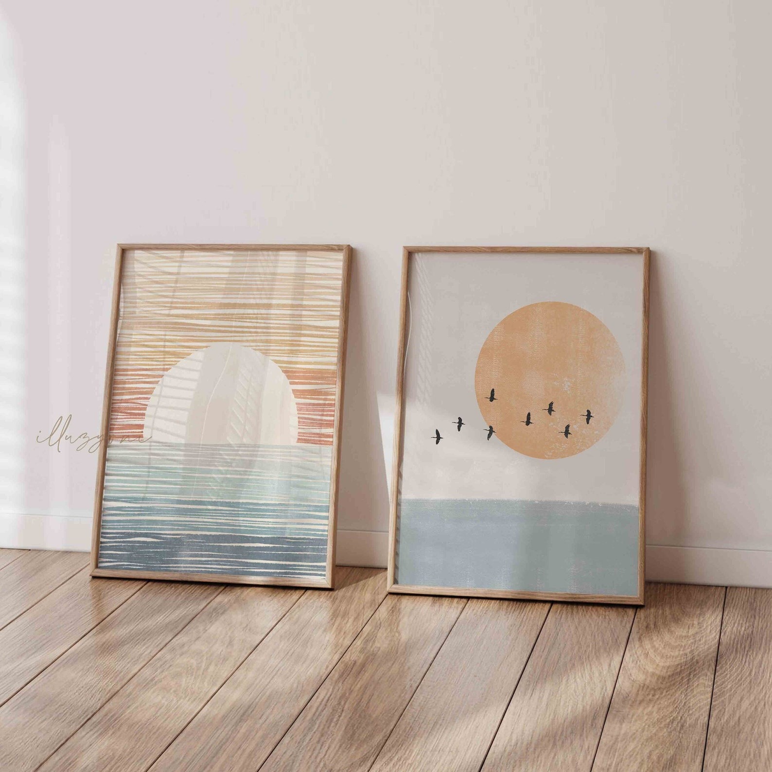 ست ۲ تایی تابلو دکوراتیو طلوع و دریا، مجموعه‌ای الهام‌بخش با سادگی مطلق است که حسی از آرامش ساحلی را به خانه شما می‌آورد. این ست با طراحی مینیمال و هندسی خورشید (یا ماه)، دریا و پرواز پرندگان، در ترکیب با رنگ‌های نارنجی پاستلی، آبی کم‌رنگ و کرم خنثی، انتخابی عالی برای دکوراسیون‌های اسکاندیناوی، بوهو و مینیمال است.ویژگی‌های ساخت و کیفیت :