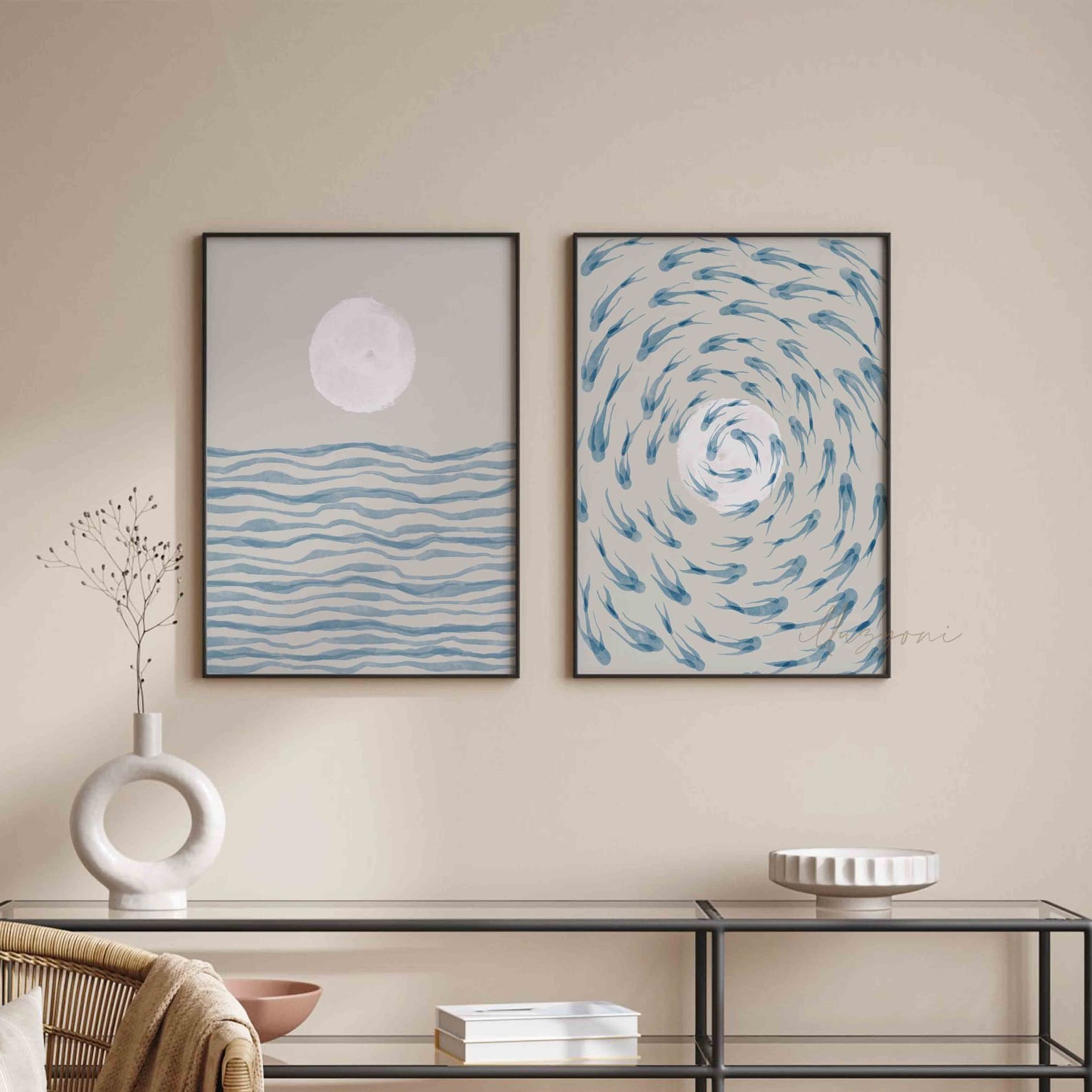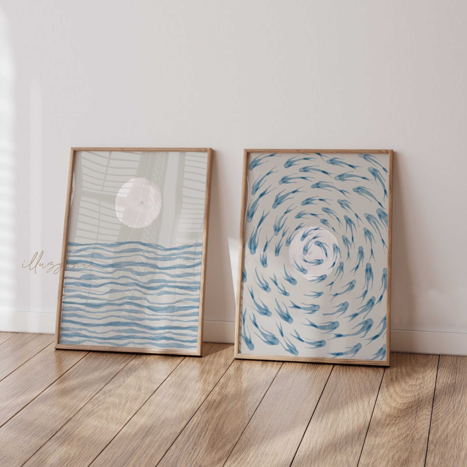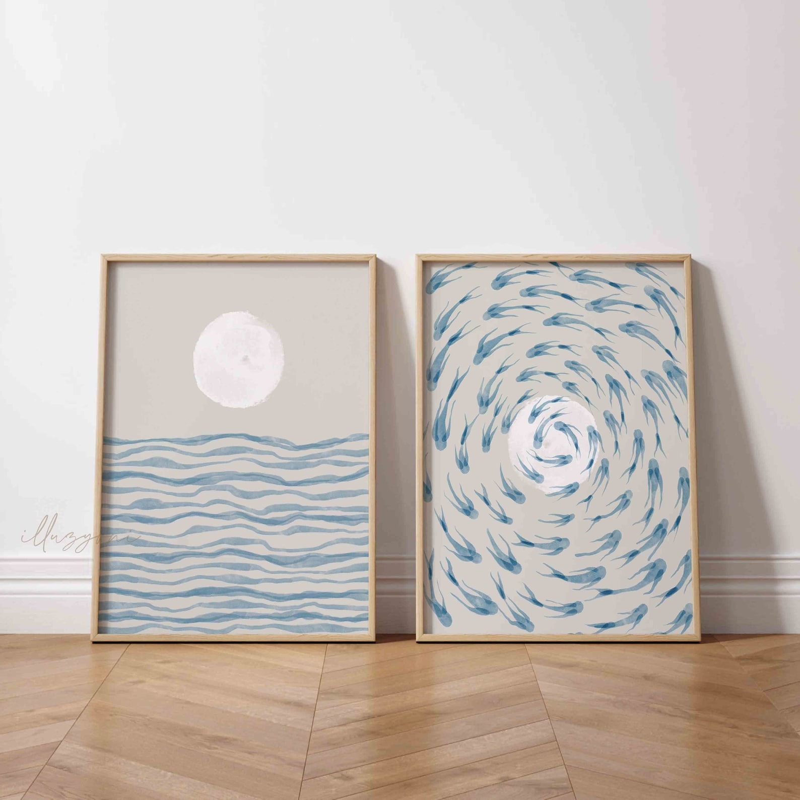 ست ۲ تایی ماهی‌های آبی، مجموعه‌ای آرامش‌بخش با الهام از دریا و طبیعت است. این ست شامل دو تابلوی مکمل (ماه و موج آرام و چرخش ماهی‌ها) با تکنیک آبرنگی و مینیمال است. استفاده از رنگ‌های آبی ملایم و بژ خنثی، آن را به انتخابی عالی برای دکوراسیون‌های مینیمال، بوهو و ساحلی تبدیل می‌کند. این ست، حسی از آرامش عمیق را به اتاق خواب یا نشیمن شما می‌بخشد.