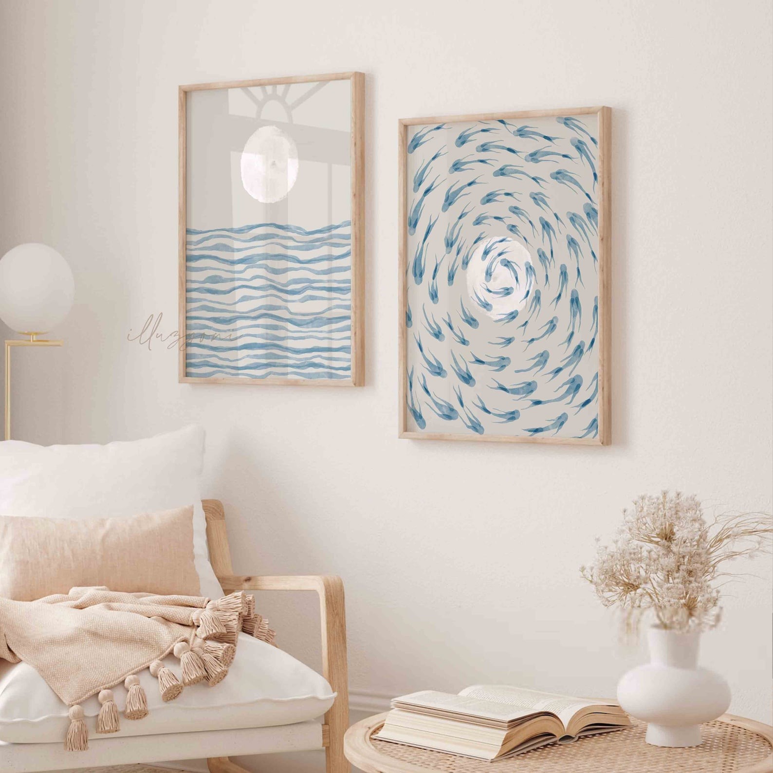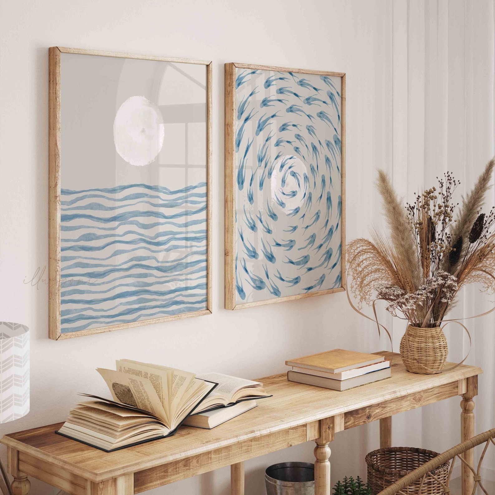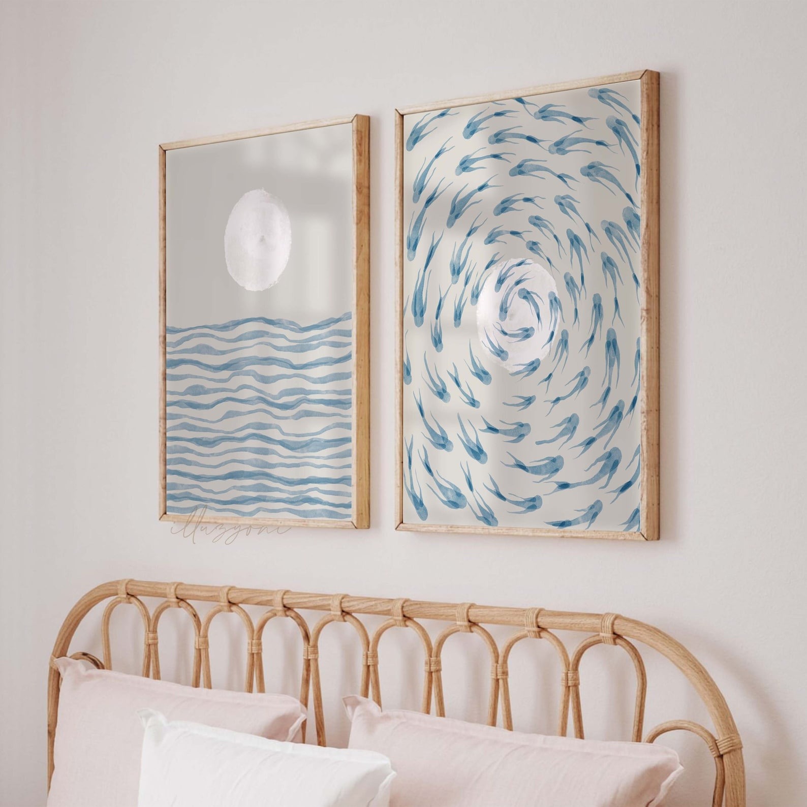 ست ۲ تایی ماهی‌های آبی، مجموعه‌ای آرامش‌بخش با الهام از دریا و طبیعت است. این ست شامل دو تابلوی مکمل (ماه و موج آرام و چرخش ماهی‌ها) با تکنیک آبرنگی و مینیمال است. استفاده از رنگ‌های آبی ملایم و بژ خنثی، آن را به انتخابی عالی برای دکوراسیون‌های مینیمال، بوهو و ساحلی تبدیل می‌کند. این ست، حسی از آرامش عمیق را به اتاق خواب یا نشیمن شما می‌بخشد.